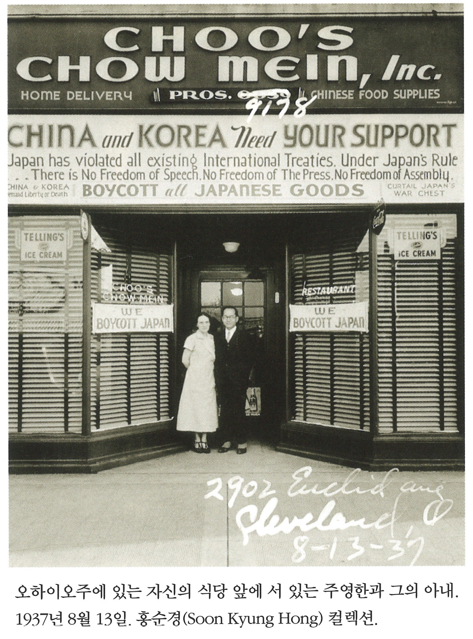 | oHOg7QVzSwyD8zRBavJwiA | 사진 | 오하이오주에 있는 자신의 식당 앞에 서 있는 주영한과 그의 아내. 1937년 8월 13일. 홍순경(Soon Kyung Hong) 컬렉션. | 주영한, 홍순경 | NULL |