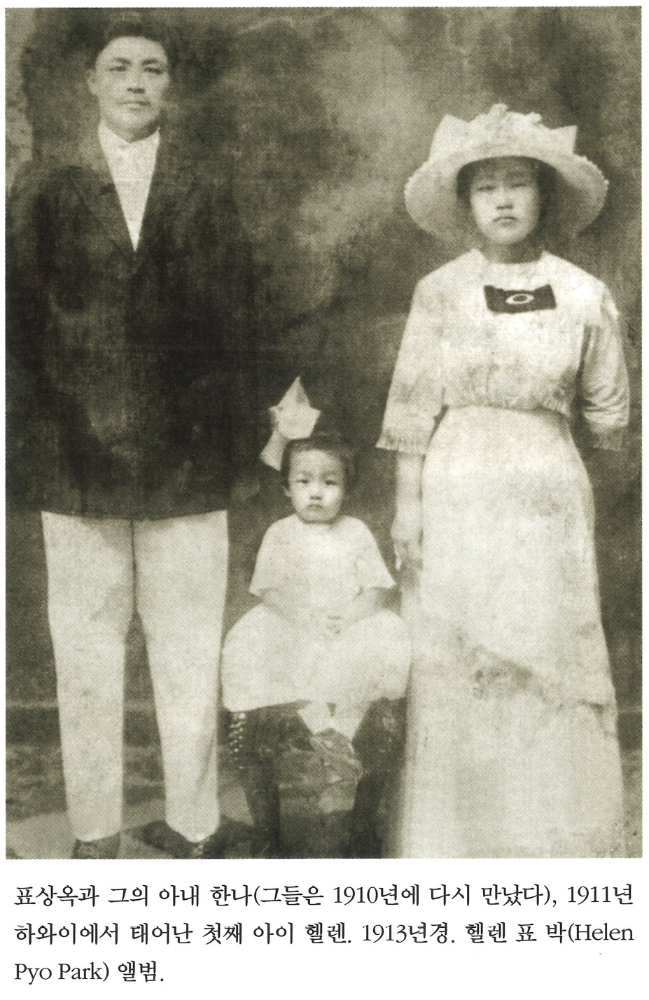 | an0MQ93ORlWzo1K2SKpSiQ | 사진 | 표상옥과 그의 아내 한나(그들은 1910년에 다시 만났다), 1911년 하와이에서 태어난 첫째 아이 헬렌. 1913년경. 헬렌 표 박(Helen | 표상옥, 한나, 헬렌 | NULL |
