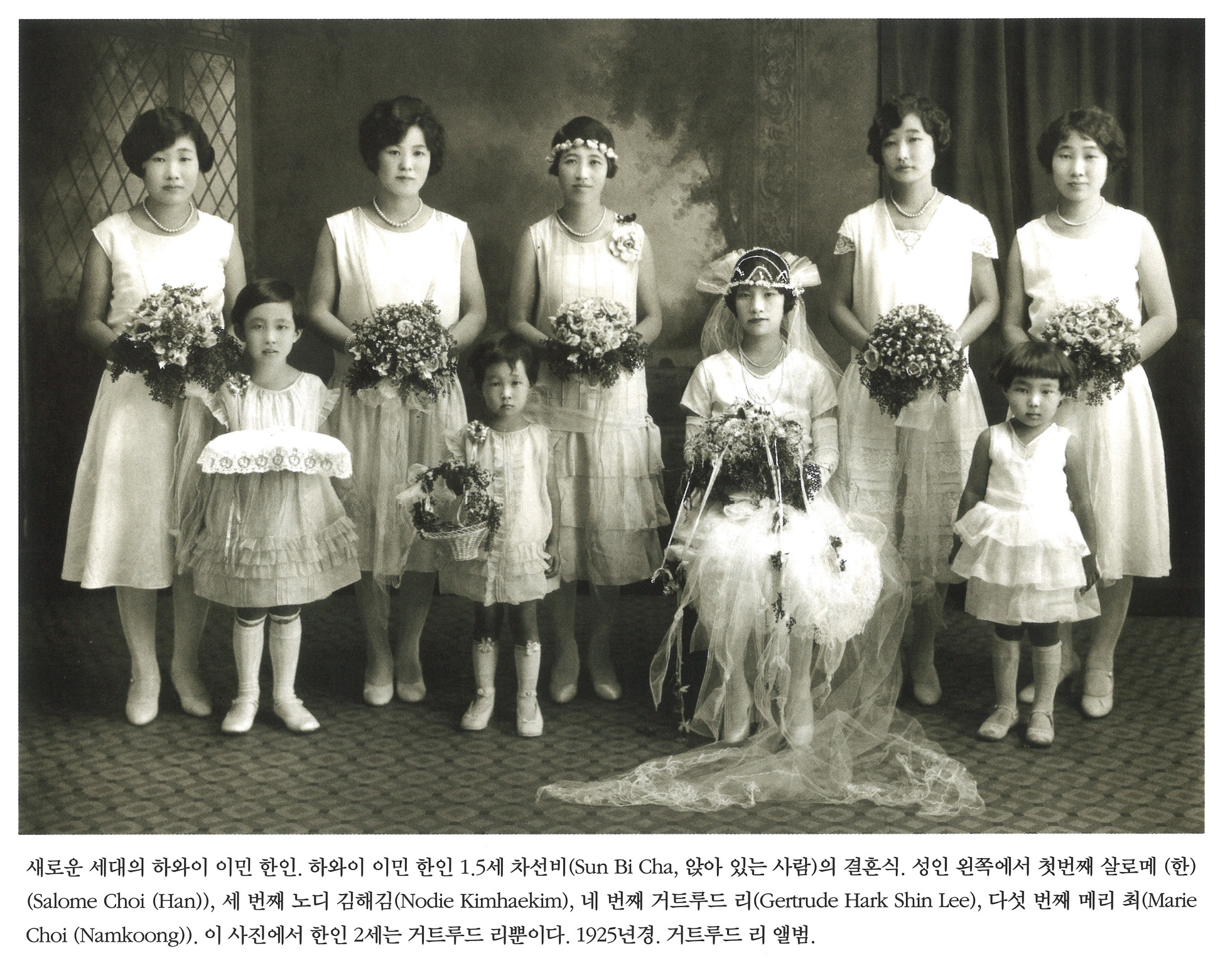 | vKl0uco2QDyJCbus3Ihs6g | 사진 | 새로운 세대의 하와이 이민 한인. 하와이 이민 한인 1.5세 차선비(, 앉아있는 사람)의 결혼식. 성인 왼쪽에서 첫번째 살로메(한)()Salom | 1. 차선비 2. 살로메 최 (Salome Choi (Han)) 3. 노디 김해김 (Nodie KimhaeKim) 4. 거트루드 리 (Gertr | NULL |