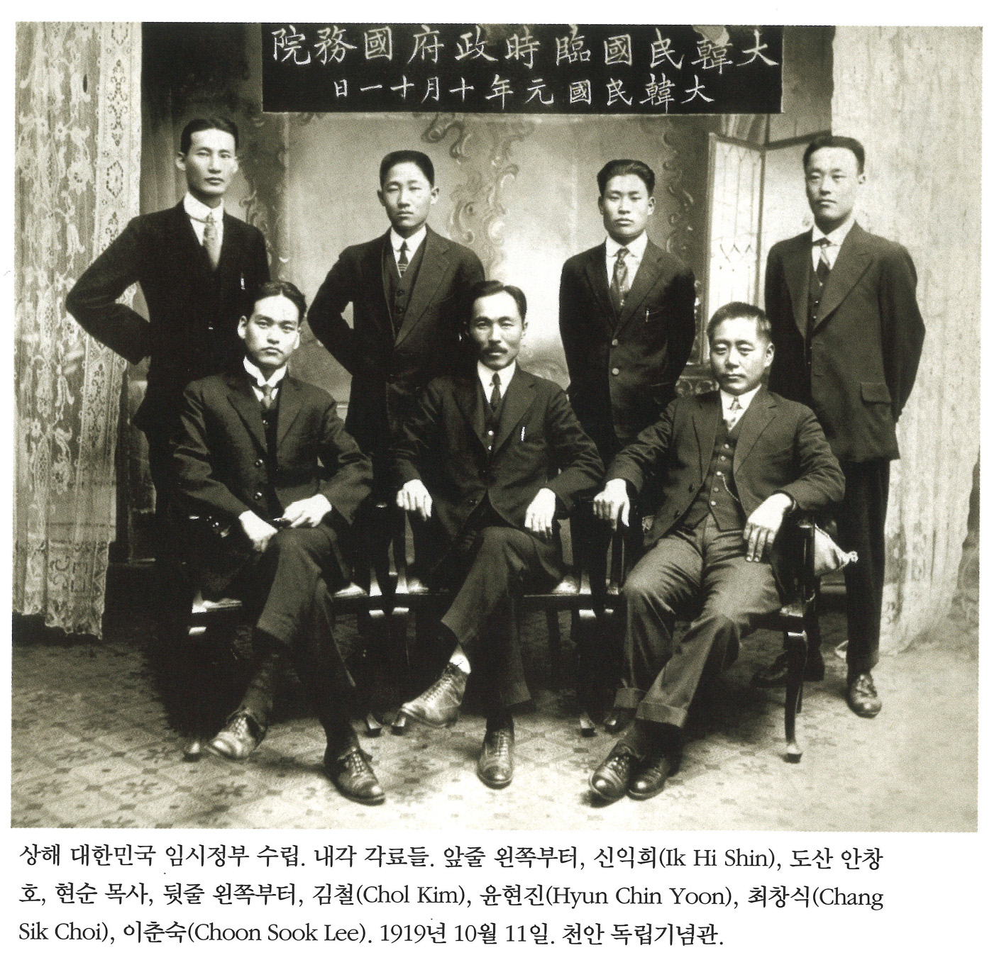 | nzrQCnkLSaKaIM7.aQseYQ | 사진 | 상해 대한민국 임시정부 수립. 내각 관료들. 앞줄 왼쪽부터, 신익희(Ik Hi Shin), 도산 안창호, 현순 목사, 뒷줄 왼쪽부터, 김철(Ch | 신익희, 도산 안창호, 현순, 김철, 윤현진, 최창식, 이춘숙. | NULL |