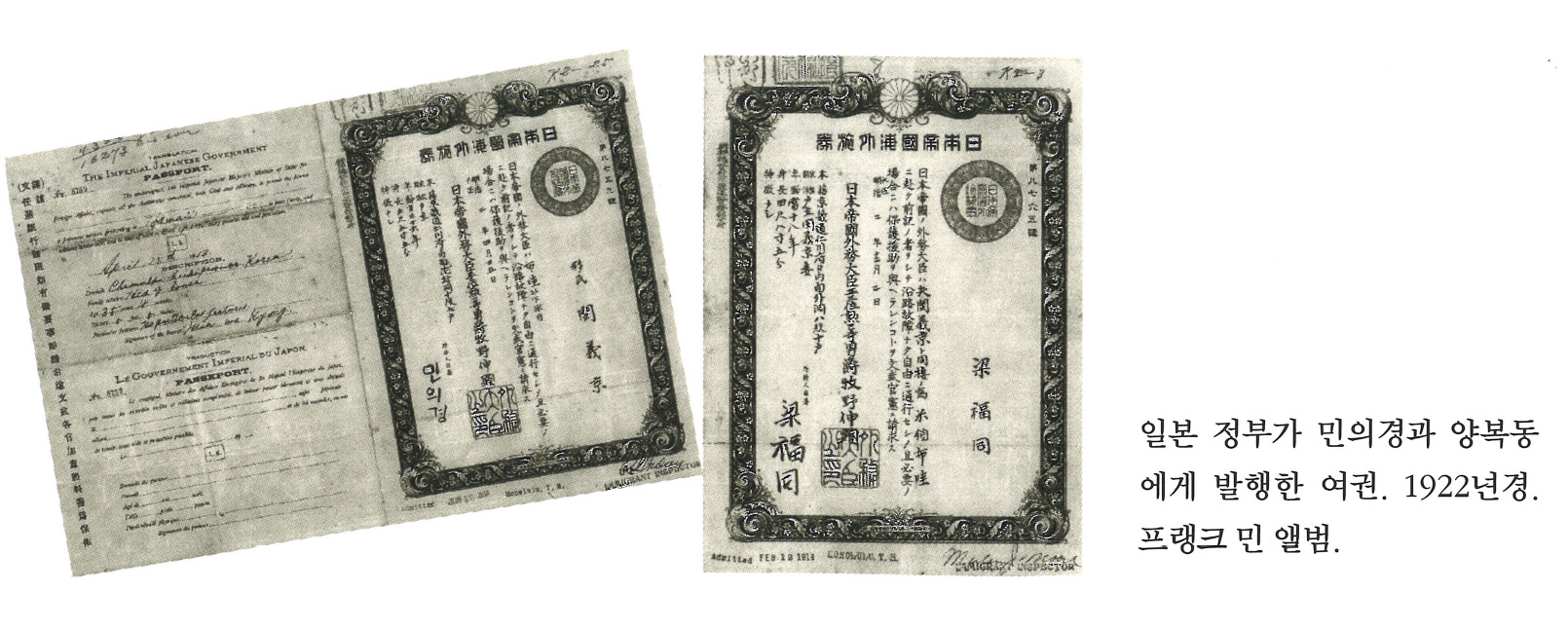 | z9HLe3uYSZyhdfaS-NhAOQ | 사진 | 일본 정부가 민의경과 양복동에게 발행한 여권. 1922년경. 프랭크 민 앨범. | 프랭크 민 앨범 | NULL |