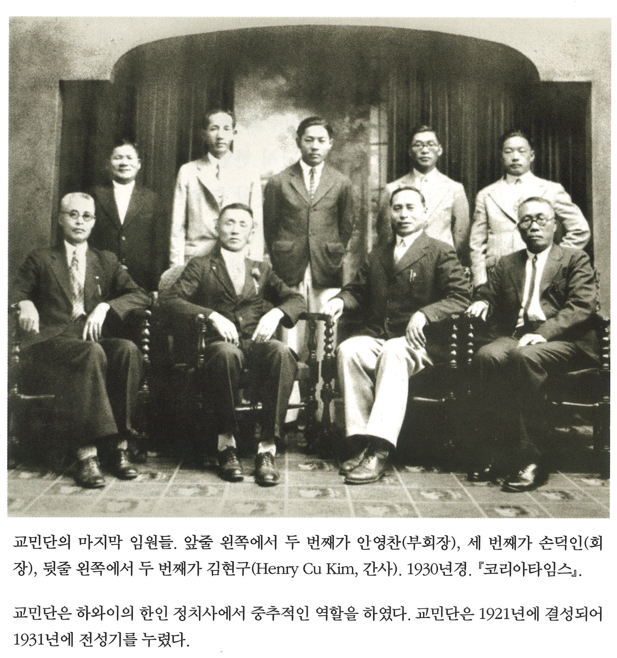| xqV.XHWLQWOAD3cc56a3TA | 사진 | 교민단의 마지막 임원들. 앞줄 왼쪽에서 두 번째가 안영찬(부회장), 세 번째가 손덕인(회장), 뒷줄 왼쪽에서 두 번째가 김현구(, 간사). 19 | 안영찬, 손덕인, 김현구 | NULL |