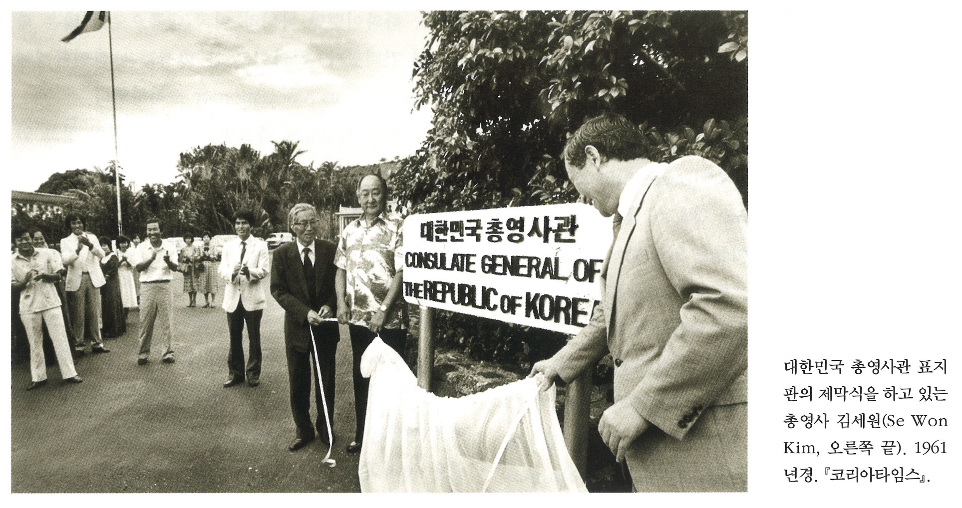 | XjYx5.IKTX2tNyUV7PInzg | 사진 | 대한민국 총영사관 표지판의 제막식을 하고 있는 총영사 김세원(Se Won Kim, 오른쪽 끝). 1961년경. 『 코리아타임스』. | 김세원 | NULL |