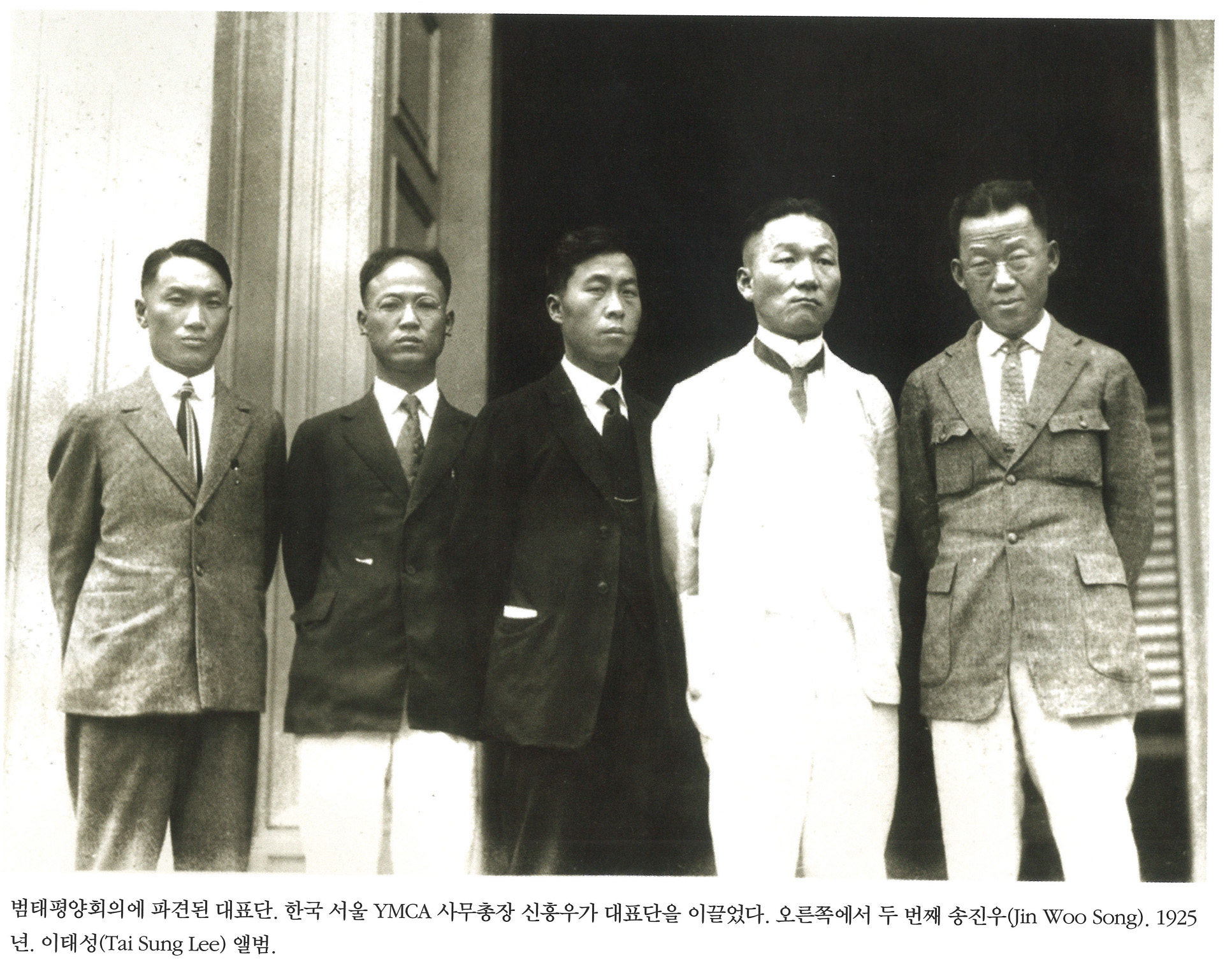 | XJB.FoHuQ5OOYU9GDAAh5A | 사진 | 범태평양회의에 파견된 대표단. 한국 서울 YMCA 사무총장 신흥우가 대표단을 이끌었다. 오른쪽에서 두 번째 송진우(Jin Woo Song). 1 | 신흥우, 송진우, 이태성 | NULL |