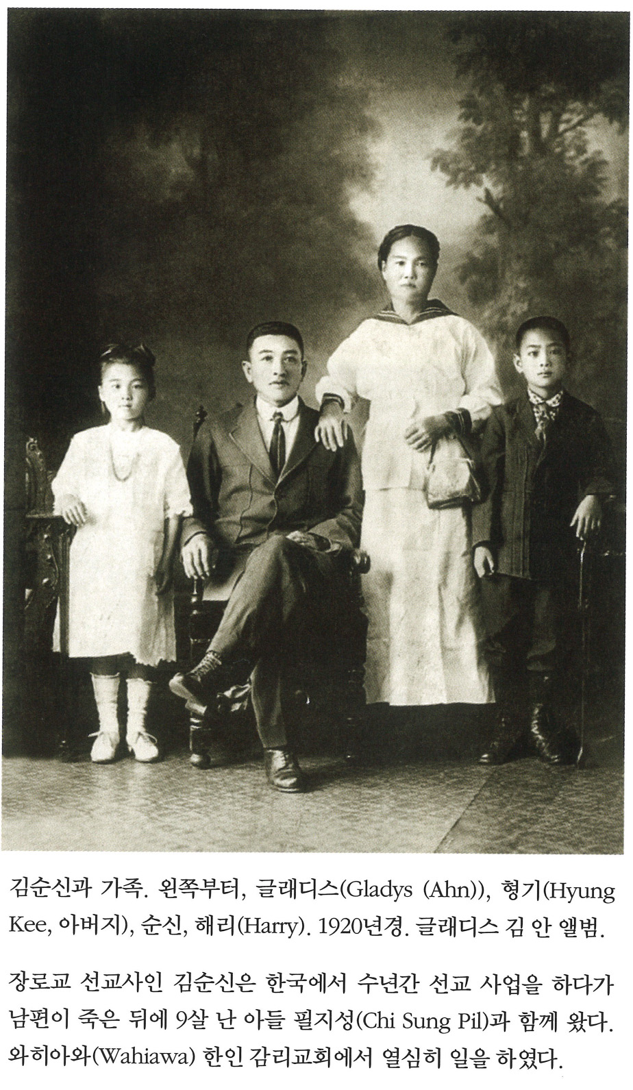 | XU.8SH8VSCePBp-r-hN4-w | 사진 | 김순신과 가족. | 김순신 | 왼쪽부터, 글래디스(Gladys (Ahn)), 형기(Hyung Kee, 아버지), 순신, 해리(Harry). 1920년경. 글래디스 김 안 앨범 |