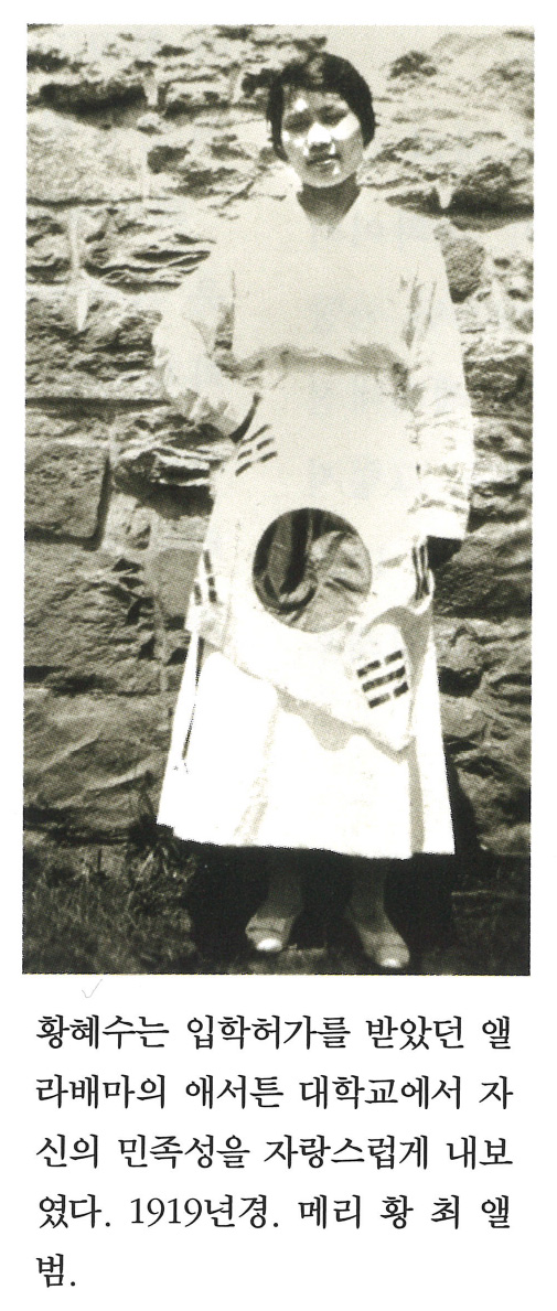 | 2C6yecfATtS4pQdwfIjfEA | 사진 | 황혜수는 입학허가를 받았던 앨라배마의 애서튼 대학교에서 자신의 민족성을 자랑스럽게 내보였다. 1919년경. 메리 황 최 앨범. | 황혜수, 메리 황 최 | NULL |