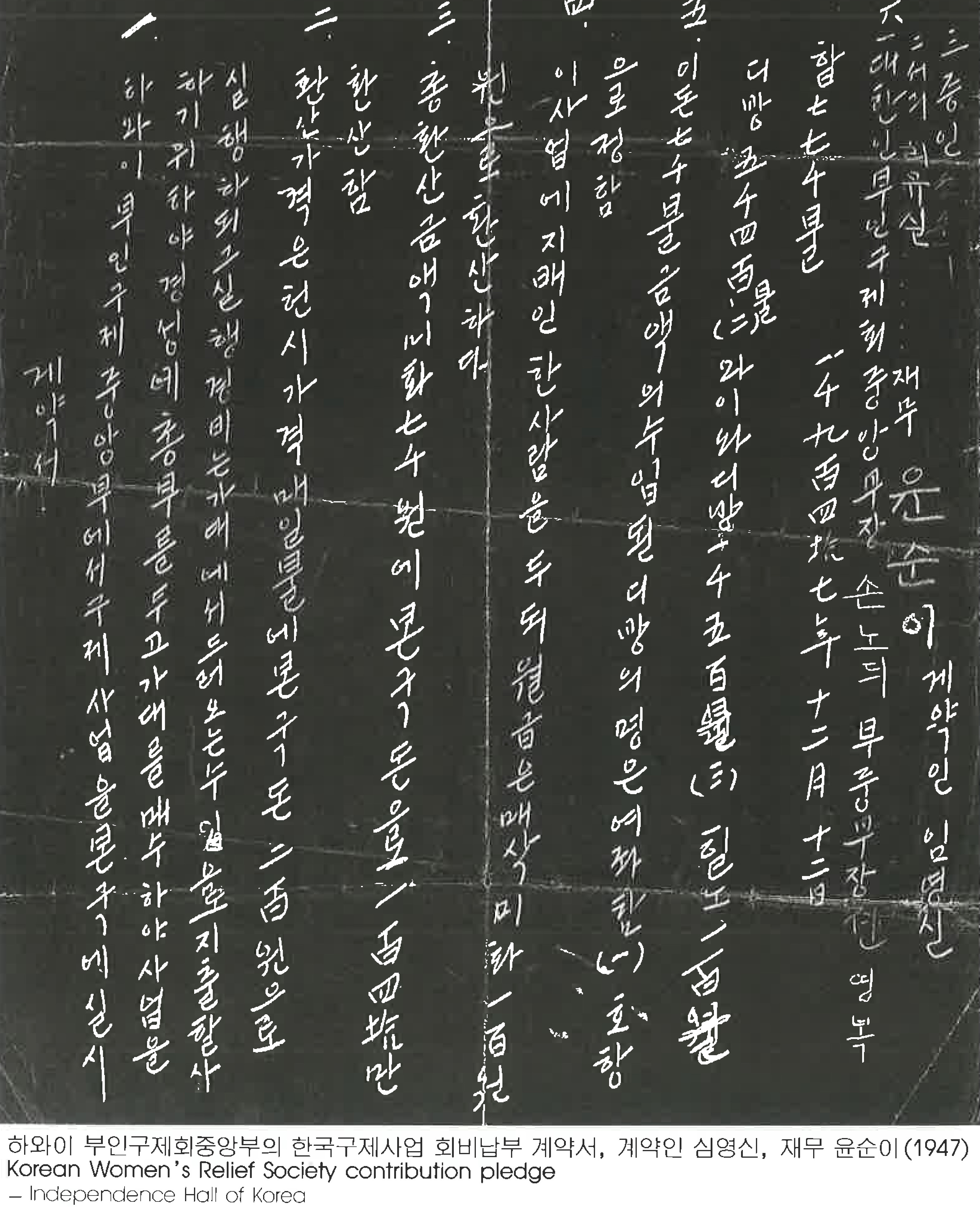 | kdQRKI2JSr-6TEzWK4.2YQ | NULL | 하와이 부인구제회중앙부의 한국구제사업 회비납부 계약서,계약인 심영신,재무 윤순이 (1947) Korean Women’s Relief Societ | 심영신, 윤순이 | NULL |