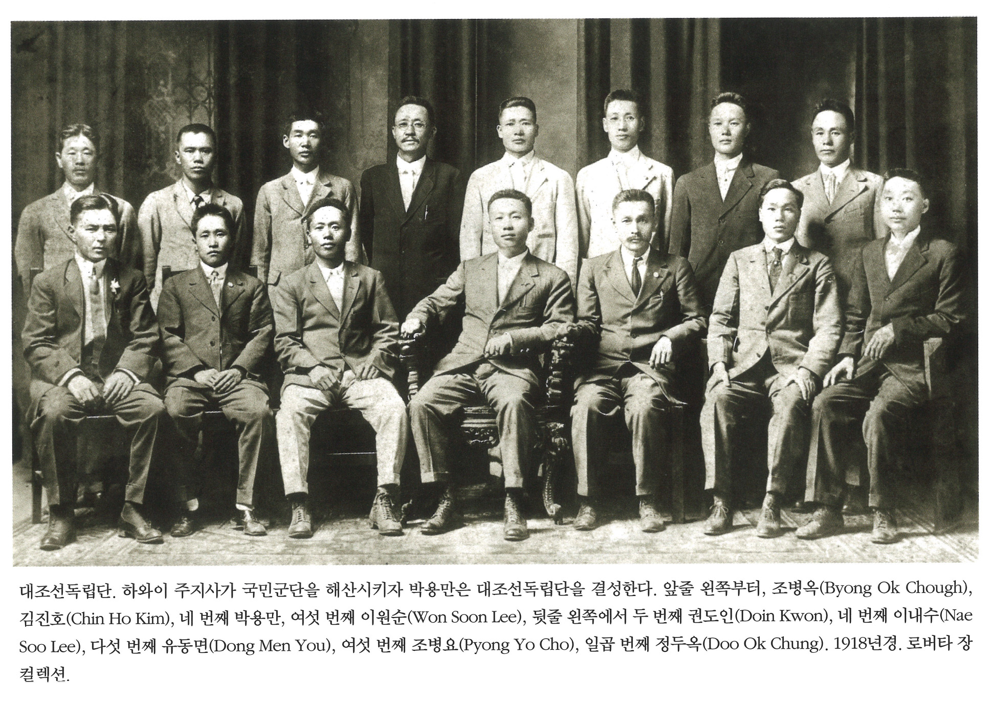 | 3lkQzcX-QXCaLc3dxIZg-Q | 사진 | 대조선독립단. 하와이 주지사가 국민군단을 해산시키자 박용만은 대조선독립단을 결성한다. 앞줄 왼쪽부터, 조병옥(Byong Ok Chough), 김 | 1. 박용만 2. 조병옥 (Byong Ok Chough) 3. 김진호 (Chin Ho Kim) 4. 이원순 (Won Soon Lee) 5. 권도 | NULL |