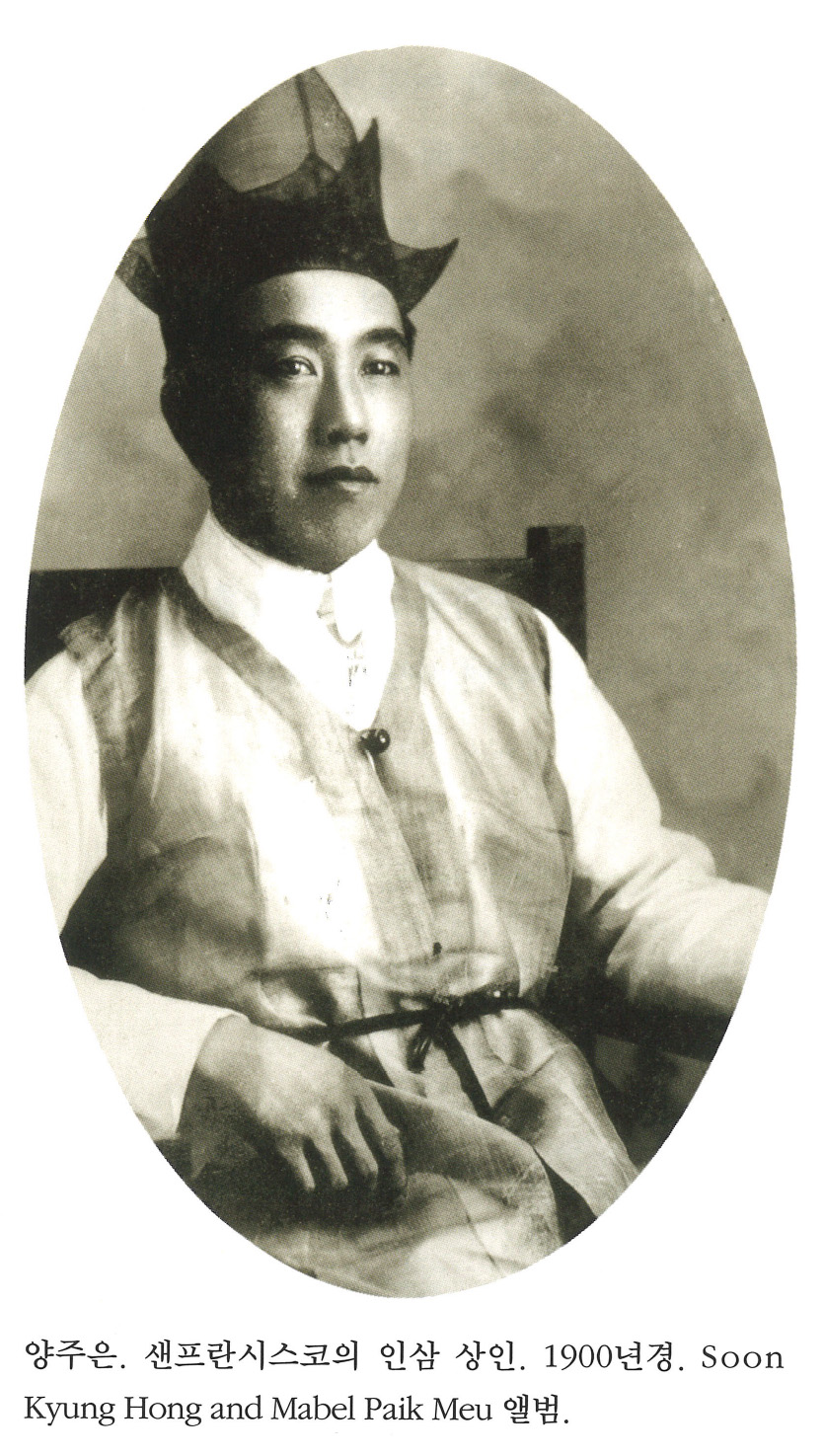 | fb9TsbVjQxmjeHhioedeVA | 사진 | 양주은, 샌프란시스코의 인삼 상인. 1900년경. Soon Kyung Hong and Mabel Paik Meu 앨범. | 양주은, Soon Kyung Hong, Mabel Paik Meu | NULL |