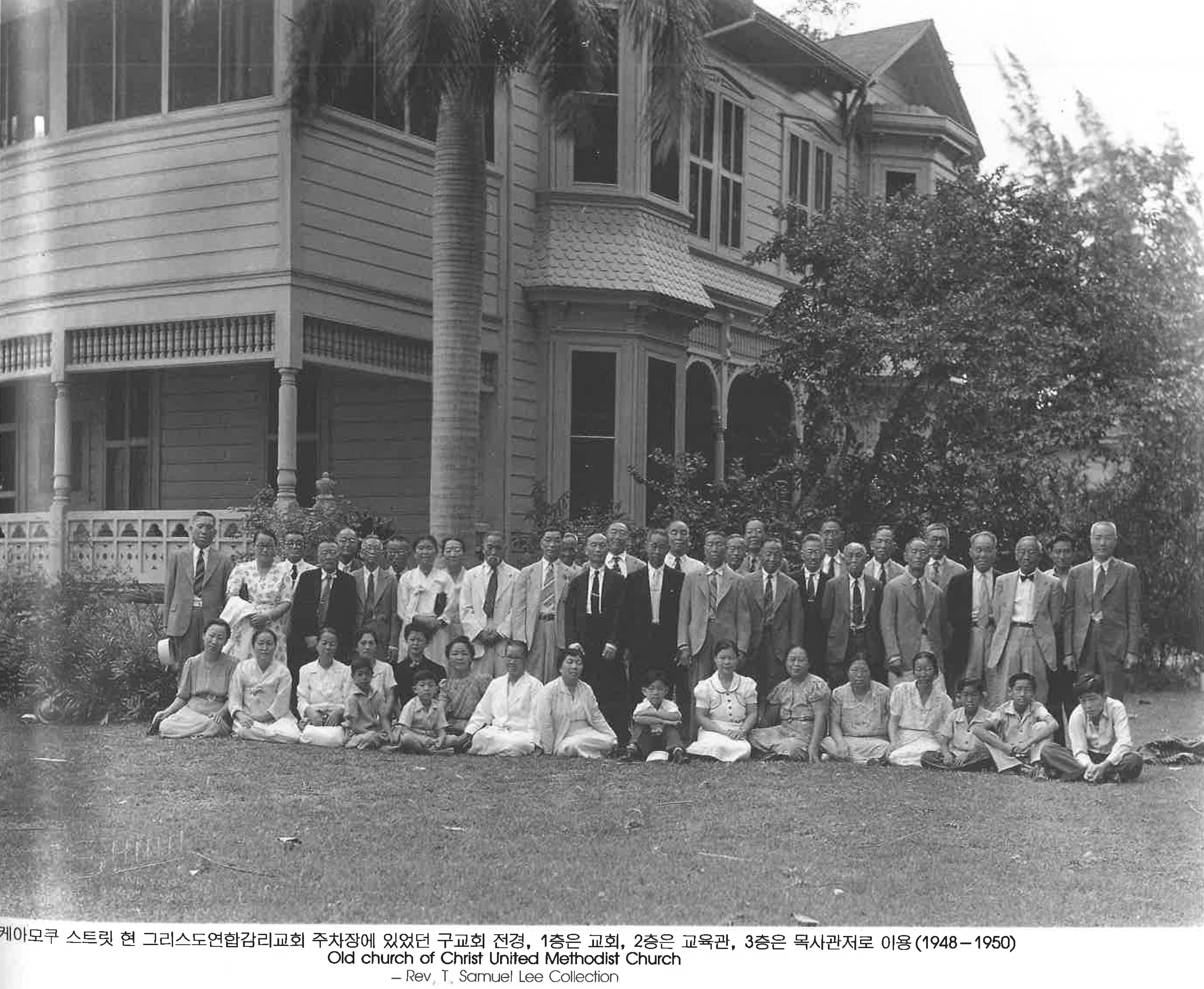 | G5CPqfhoRnmWBNM8iAkoqA | NULL | 케아모쿠 스트릿 현 그리스도 연합감리교회 주차장에 있었던 구교회 전경, 1층은 교회, 2층은 교육관, 3층은 목사관저로 이용(1948-1950) | 케아모쿠 스트릿 현 그리스도 연합감리교회 | NULL |