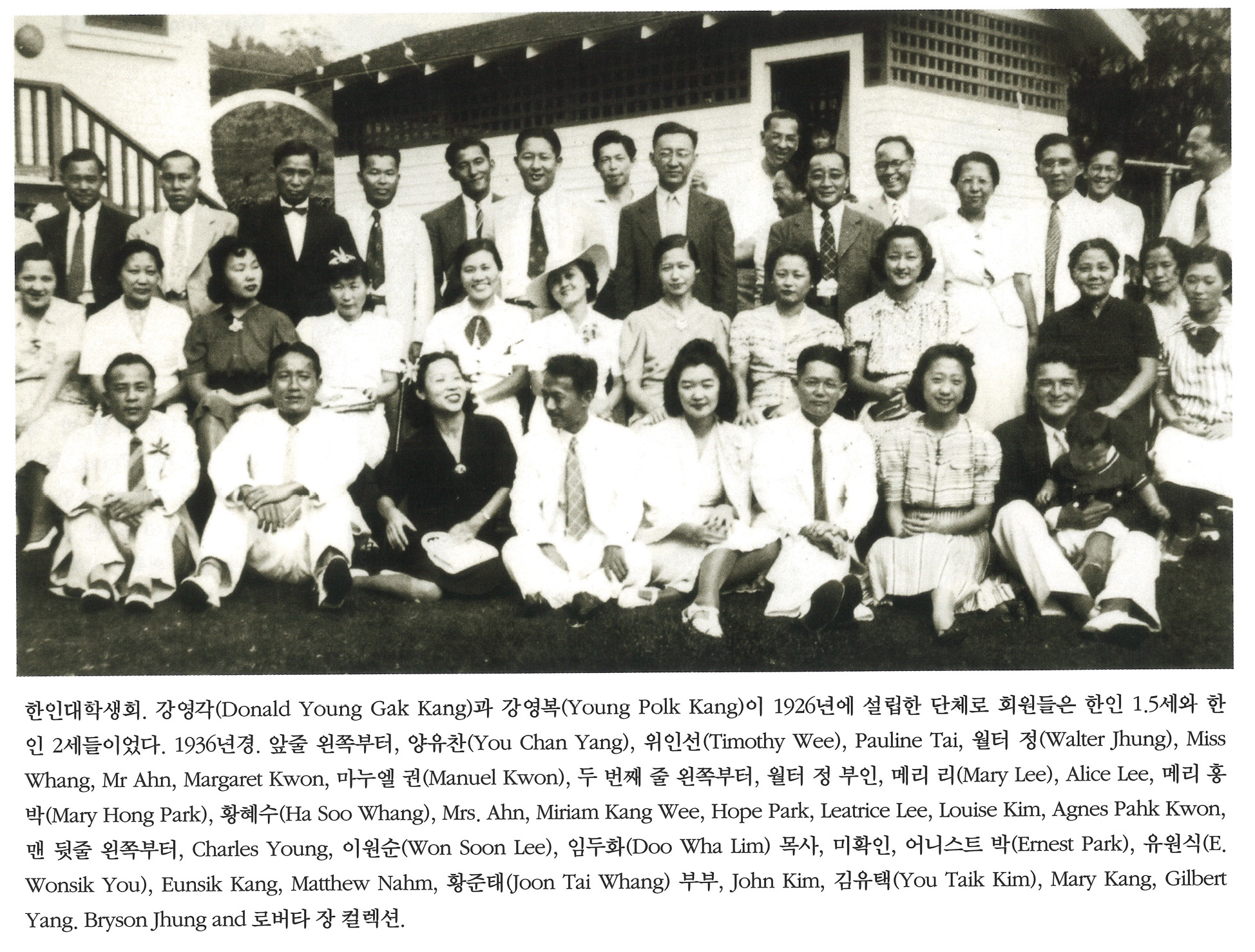 | ZGY3xxzGS0uBZmLh5.Im7Q | 사진 | 한인대학생회. 강영각(Donlad Young Gak Kang)과 강영복(Young Polk Kang)이 1926년 설립한 단체로 회원들은 한인 | - 강영각 (Donald Young Gak Kang) - 강영복 (Young Polk Kang) - 양유찬 (You Chan Yang) - 위인 | NULL |