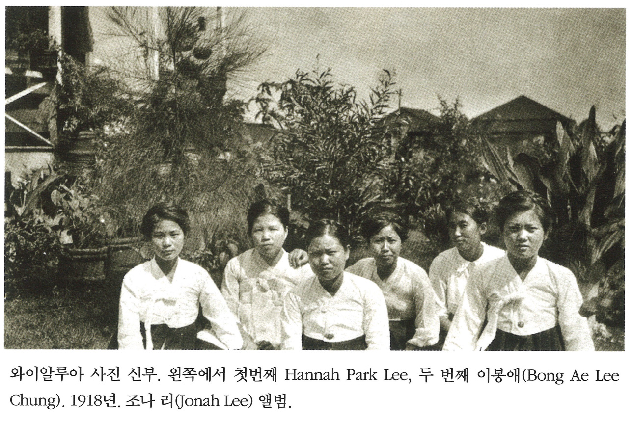 와이알루아 사진 신부. 왼쪽에서 첫번째 Hannah Park Lee, 두 번째 이봉애(Bong Ae Lee). 1918년. 조나 리(Jonah Lee) 앨범.