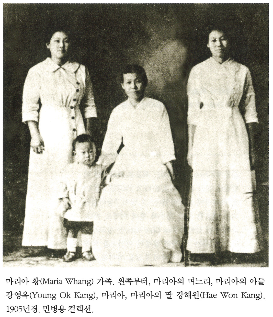 마리아 황(Maria Whang) 가족. 왼쪽부터, 마리아의 며느리, 마리아의 아들 강영옥(Young Ok Kang), 마리아, 마리아의 딸 강해원(Hae Won Kang). 1905년경. 민병용 컬렉션.