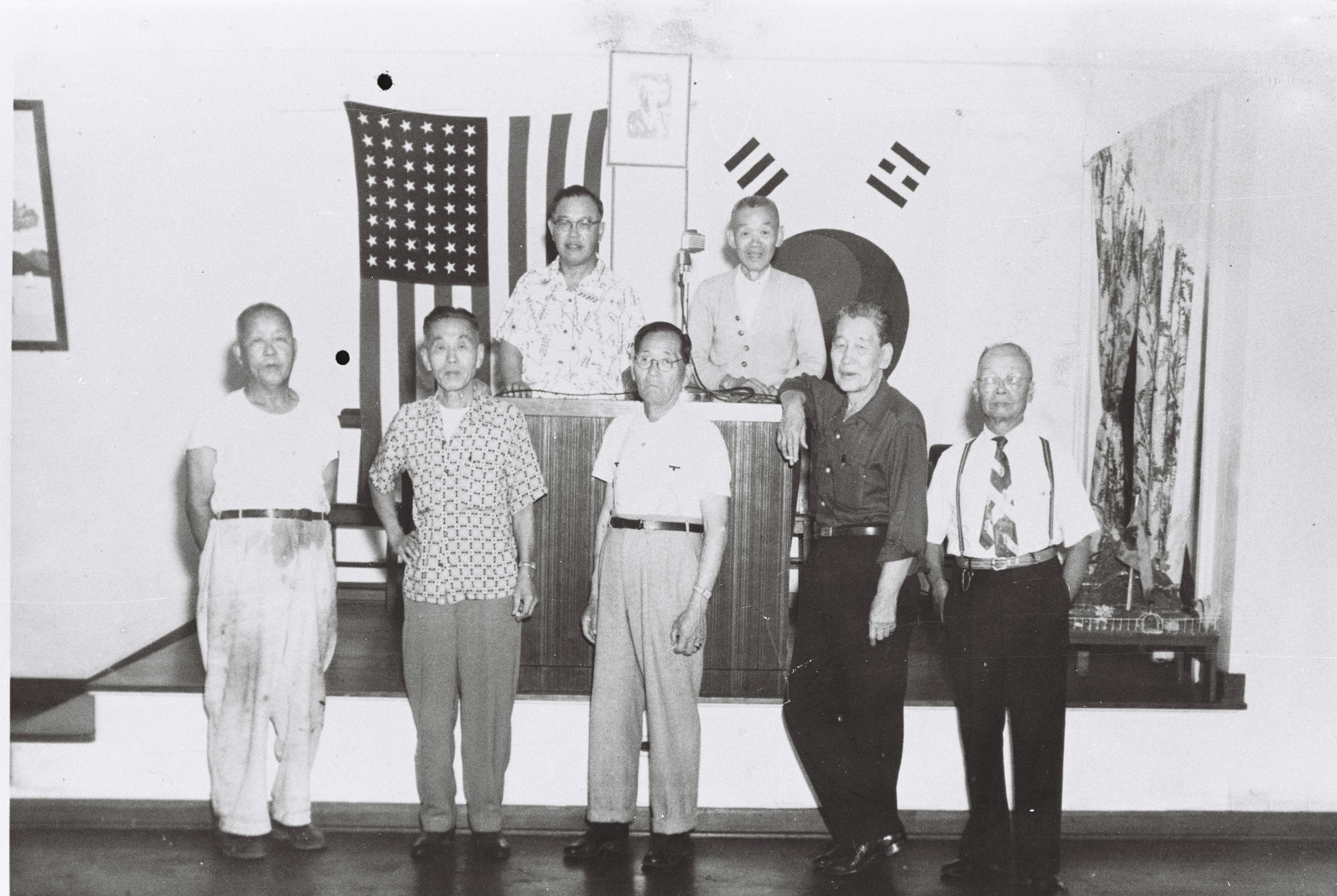 동지회 회원,앞줄 오른쪽 : 최관우. 뒷줄 왼쪽 : 전진택. 오른쪽 : 민근호 Members in the Dongji Hoi’s conference room
