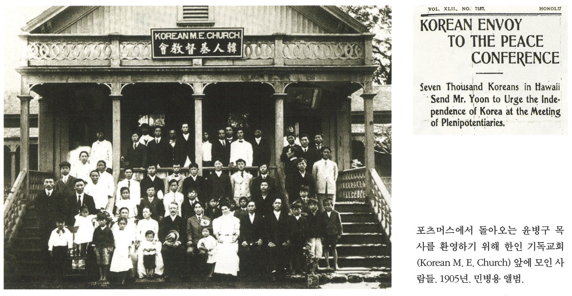 포츠머스에서 돌아오는 윤병구 목사를 환영하기 위해 한인 기독교회(Korean M. E. Church) 앞에 모인 사람들. 1905년. 민병용 앨범.