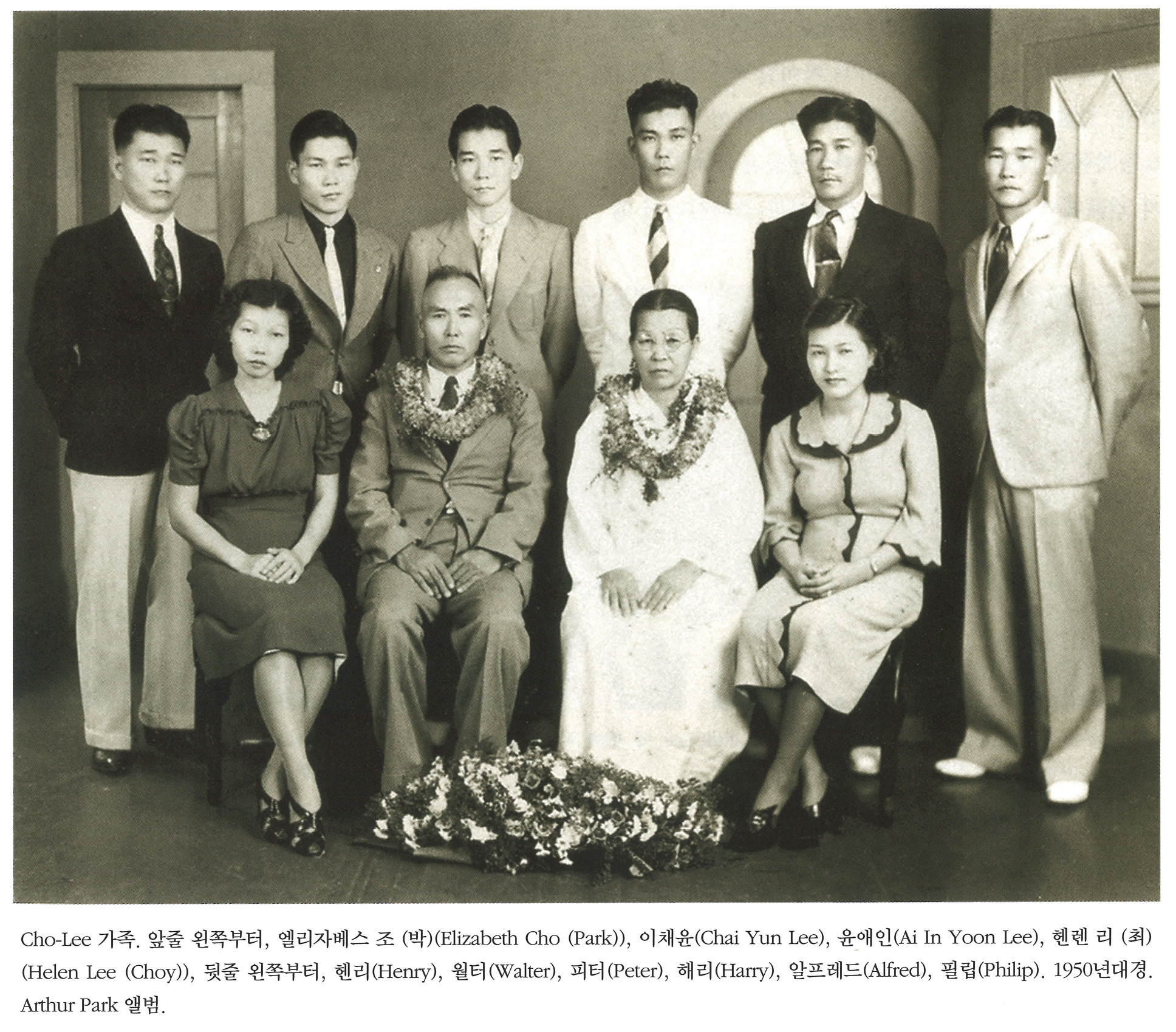 Cho-Lee 가족. 앞줄 왼쪽부터, 엘리자베스 조 (박) (Elizabeth Cho (Park)), 이채윤(Chai Yun Lee), 윤애인(Ai In Yoon Lee), 헨렌 리(최)(Helen Lee (Choy)), 뒷줄 왼쪽부터, 헨리(Henry), 월터(Walter), 피터(Peter),해리(Harry), 알프레드(Alfred), 필립(Philip). 1950년대경. Arthur Park 앨범.
