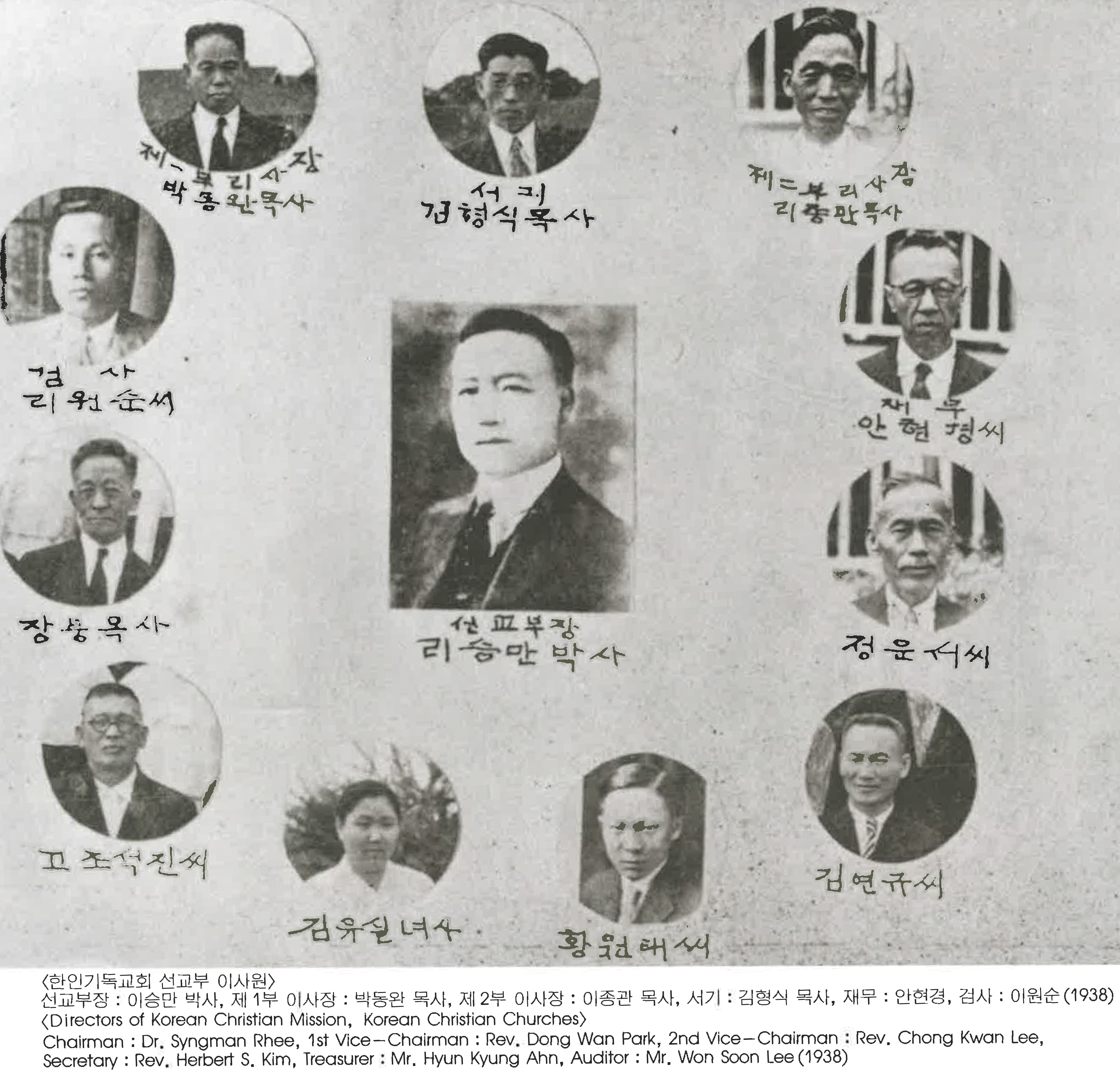 〈한인기독교회 선교부 이사원〉 선교부장 : 이승만 박시, 제 1부 이사장 : 박동완 목사,제 2부 이사장 : 이종관 목사,서기 : 김형식 목사,재무 : 안현경,검사 : 이원순(1938) (Directors of Korean Christian Mission, Korean Christian Churches) chairman : Dr. Syngman Rhee, 1st Vice-Chairman : Rev. Dong Wan Park, 2nd Vice-Chairman : Rev. Chong Kwan Lee, Secretary : Rev. Herbert S. Kim, Treasurer: Mr. Hyun Kyung Ahn, Auditor: Mr. Won Soon Lee (1938)