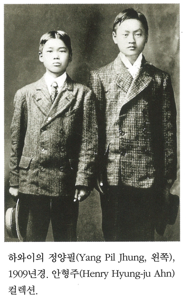 하와이의 정양필(Yang Pil Jhung, 왼쪽), 1909년경. 안형주(Henry Hyung-ju Ahn) 컬렉션.