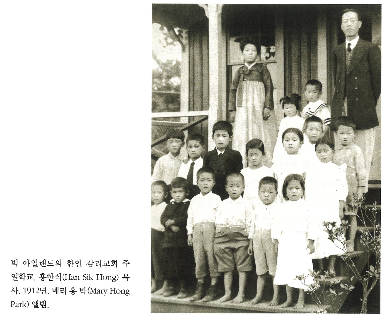 빅 아일랜드의 한인 감리교회 주일학교. 홍한식(Han Sik Hong) 목사. 1912년. 메리 홍 박(Mary Hong Park) 앨범.
