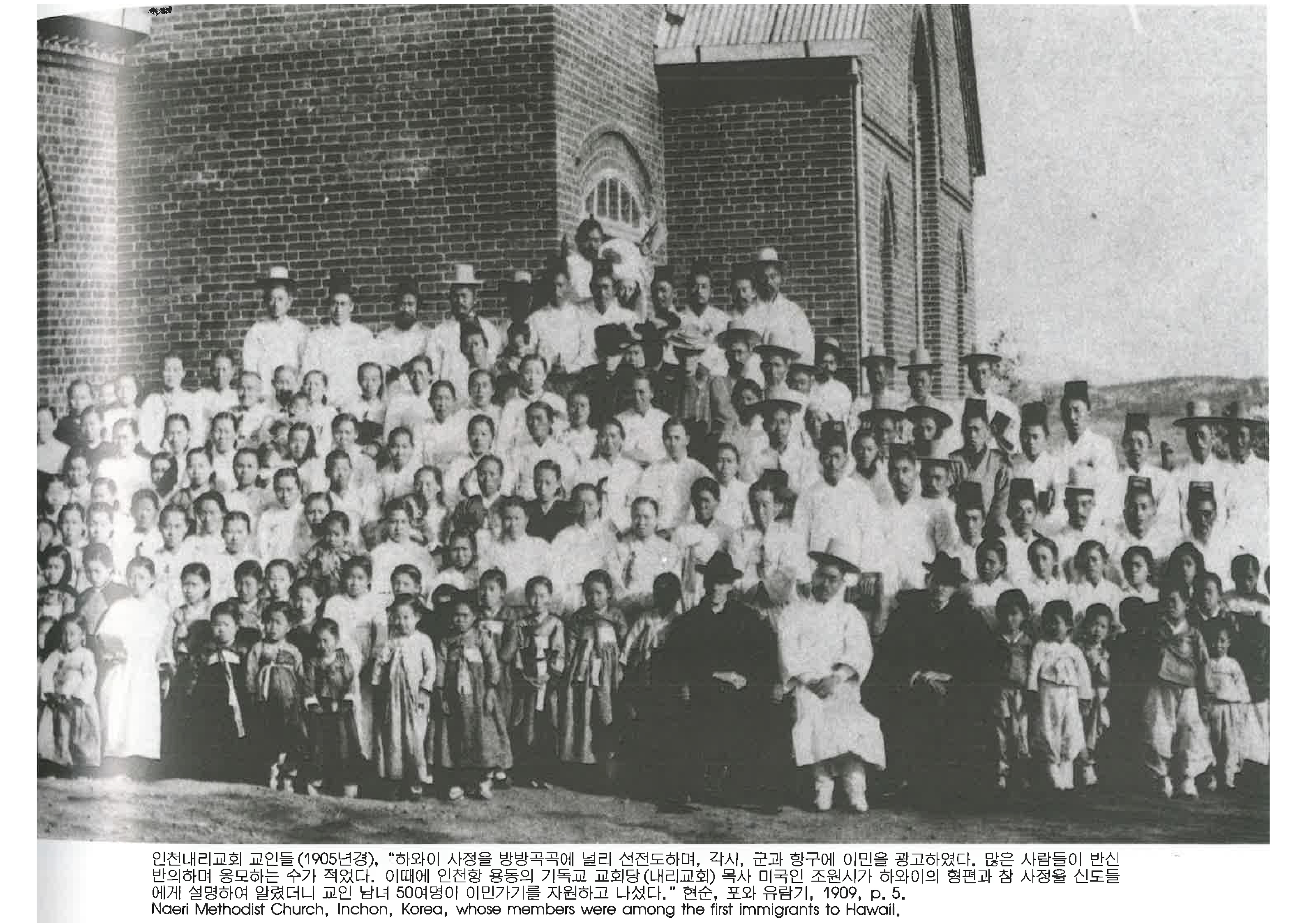 인천내리교회 교인들(1905년경), “하와이 사정을 방방곡곡에 널리 선전도하며,각시,군과 항구에 이민을 광고하였다, 많은 사람들이 반신 반의하며 응모하는 수가 적었다. 이때에 인천항 용동의 기독교 교회당(내리교히) 목사 미국인 조원시가 하와이의 형편과 참 사정을 신도들 에게 설명하여 알렸더니 교인 남녀 50여명이 이민가기를 자원하고 나섰다.” 현순,포와 유람기, 1909, p. 5. Naeri Methodist Church, Inchon, Korea, whose members were among the first immigrants to Hawaii.