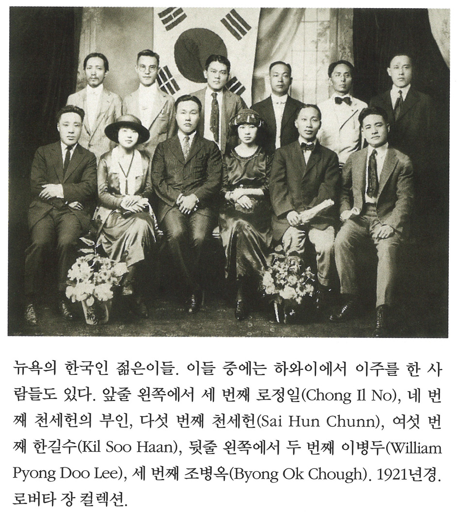 뉴욕의 한국인 젊은이들. 이들 중에는 하와이에서 이주를 한 사람들도 있다. 앞줄 왼쪽에서 세 번째 로정일(Chong Il No), 네 번재 천세헌의 부인, 다섯 번째 천세헌(Sai Hun Chunn), 여섯 번째 한길수(Kil Soo Haan), 뒷줄 왼쪽에서 두 번째 이병두(William Pyong Doo Lee), 세 번째 조병옥(Byong Ok Chough). 1921년경. 로버타 장 컬렉션.