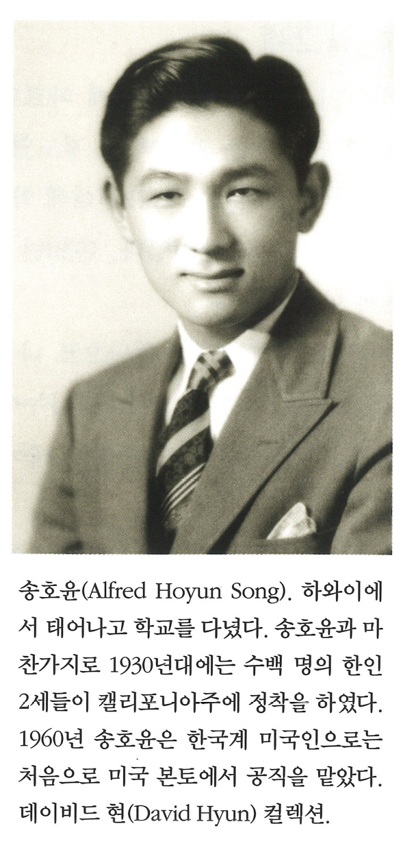 송호윤(Alfred Hoyun Song). 하와이에서 태어나고 학교를 다녔다. 송호윤과 마찬가지로 1930년대에는 수백 명의 한인 2세들이 캘리포니아주에 정착을 하였다. 1960년 송호윤은 한국계 미국인으로는 처음으로 미국 본토에서 공직을 맡았다. 데이비드 현(David Hyun) 컬렉션.