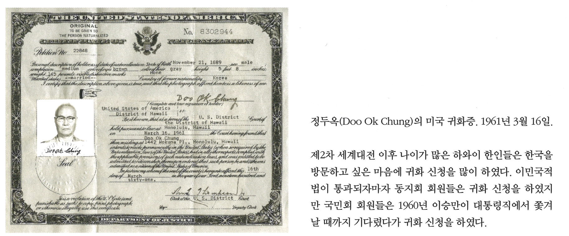 정두옥(Doo Ok Chung)의 미국 귀화증. 1961년 3월 16일. 제2차 세계대전 이후 나이가 많은 하와이 한인들은 한국을 방문하고 싶은 마음에 귀화 신청을 많이 하였다. 이민국적법이 통과되자마자 동지회 회원들은 귀화 신청을 하였지만 국민회 회원들은 1960년 이승만이 대통령직에서 쫓겨날 때까지 기다렸다가 귀화 신청을 하였다.