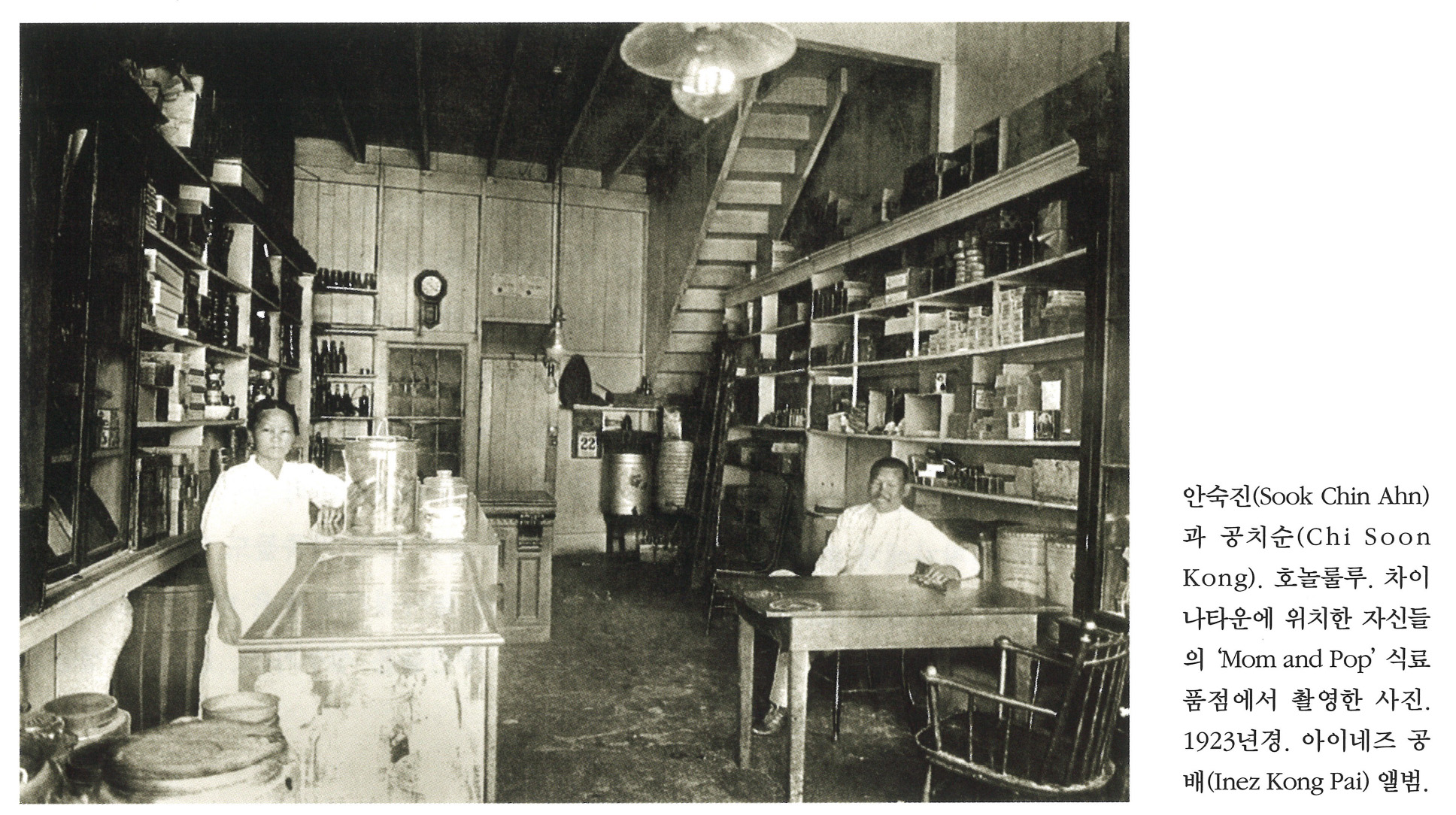 안숙진(Sook Chin Ahn)과 공치순(Chi Soon Kong). 호놀롤루. 차이나타운에 위치한 자신들의 'Mom and Pop'식료품점에서 촬영한 사진. 1923년경. 아이네즈 공배(Inez Kong Pai) 앨범.