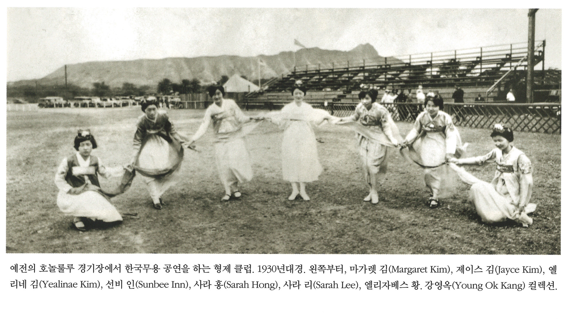 예전의 호놀롤루 경기장에서 한국무용 공연을 하는 형제 클럽. 1930년대경. 왼쪽부터, 마가렛 김(Margaret Kim), 제이스 김(Jayce Kim), 엘리네 김(Yealinae Kim), 선비 인(Sunbee Inn), 사라 홍(Sarah Hong), 사라 리(Sarah Lee), 엘리자베스 황. 강영옥(Young Ok Kang) 컬렉션.
