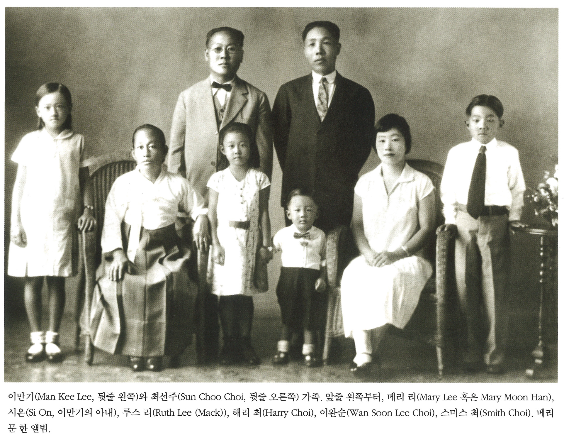 이만기(Man Kee Lee, 뒷줄 왼쪽)와 최선주(Sun Choo Choi, 뒷줄 오른쪽) 가족. 앞줄 왼쪽부터, 메리 리(Mary Lee 혹은 Mary Moon Han), 시온(Si Son, 이만기의 아내), 루스 리(Ruth Lee(Mack)), 해리 최(Harry Choi), 이완순(Wan Soon Lee Choi), 스미스 최(Smith Choi), 메리 문 한 앨범.