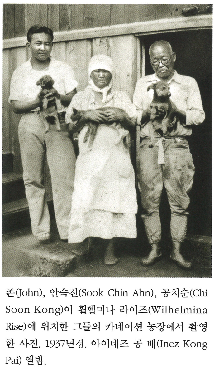 존(John), 안숙진(Sook Chin Ahn), 공치순(Chi Soon Kong)이 휠헬미나 라이즈(Whilhelmina Rise)에 위치한 그들의 카네이션 농장에서 촬영한 사진. 1937년경. 아이네즈 공 배(Inez Kong Pai) 앨범.