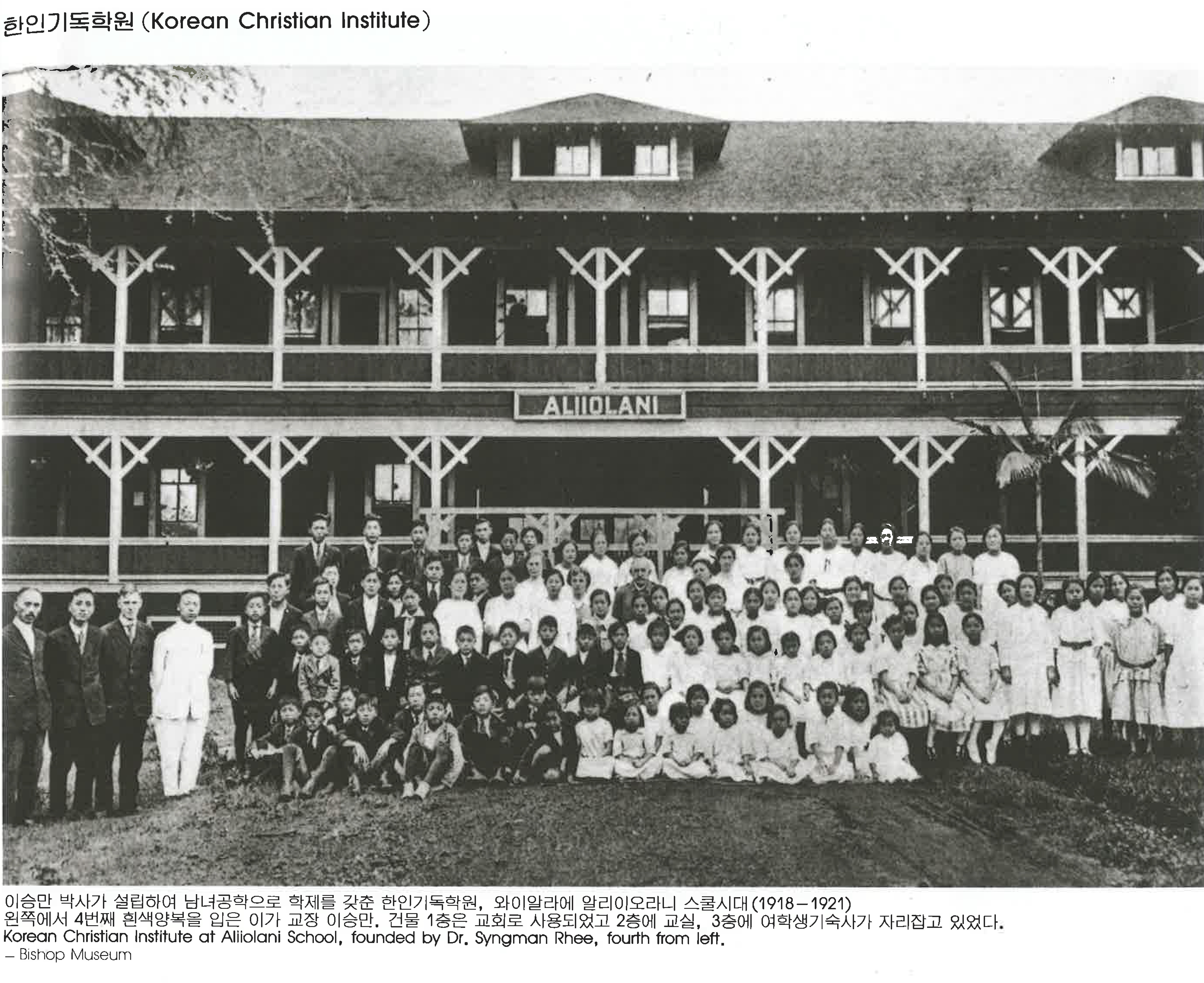 이승만 박사가 설립하여 남녀공학으로 학제를 갖춘 한인기독학원, 와이알라에 알리이오라니 스쿨시대 (1918 —1921) 왼쪽에서 4번째 흰색양복을 입은 이가 교장 이승만. 건물 1충은 교회로 사용되었고 2층에 교실,3충에 여학생기숙사가 자리잡고 있었다. Korean Christian Institute at Aliiolani School, founded by Dr. Syngman Rhee, fourth from left.