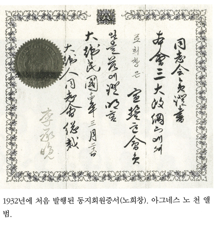 1932년에 처음 발행된 동지회원증서(노희창). 아그네스 노 천 앨범.
