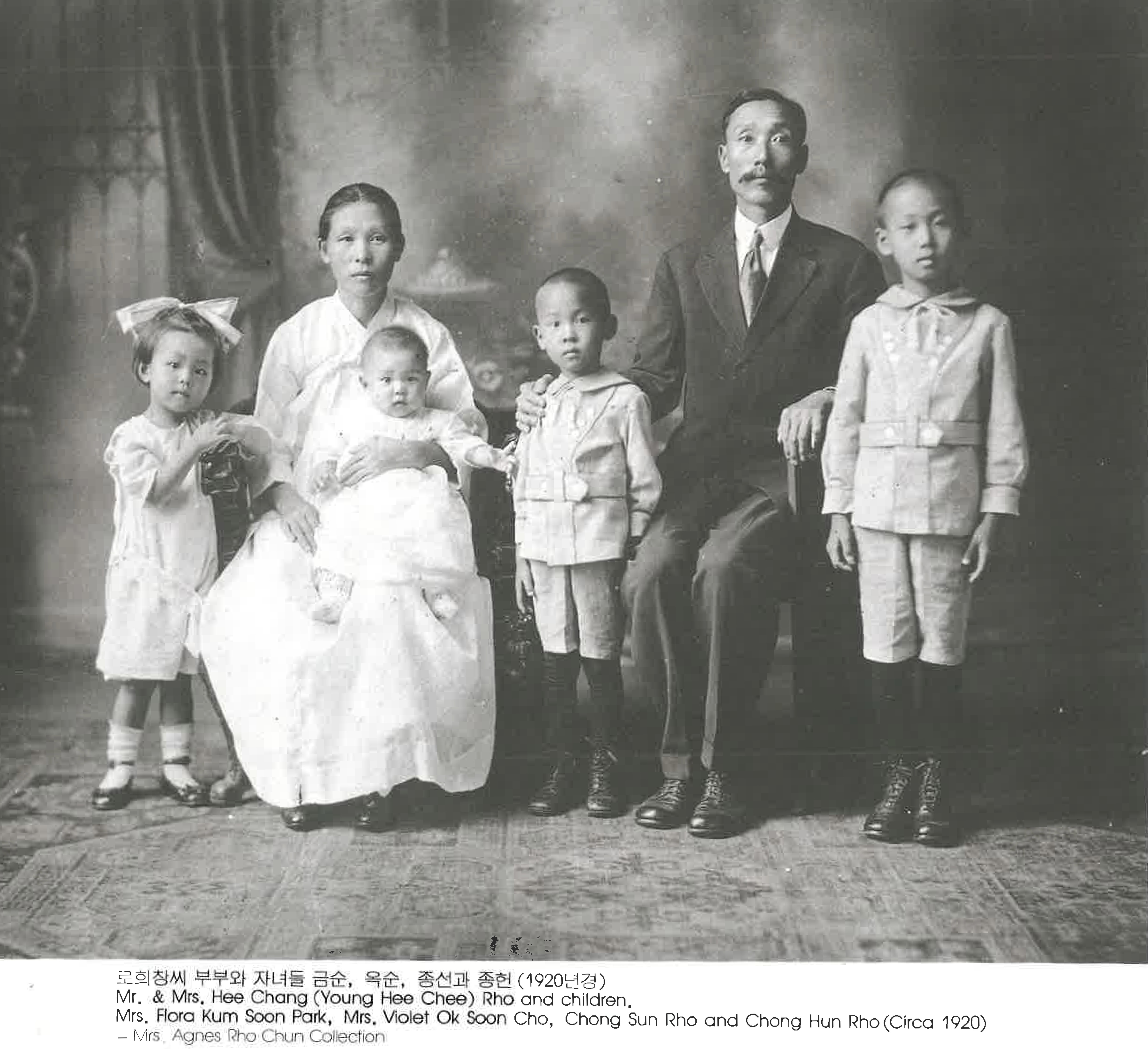 로희창 부부와 자녀들 금순, 옥순, 종선과 종헌(1920년경) Mr. & Mrs. Hee Chang(Young Hee Chee) Rho and children, Mrs. Flora Kum Soon Park, Mrs. Violet Ok Soon Cho, Chong Sun Rho and Chong Hun Rho(Circa 1920) -Mrs. Agnes Rho Chun Collection