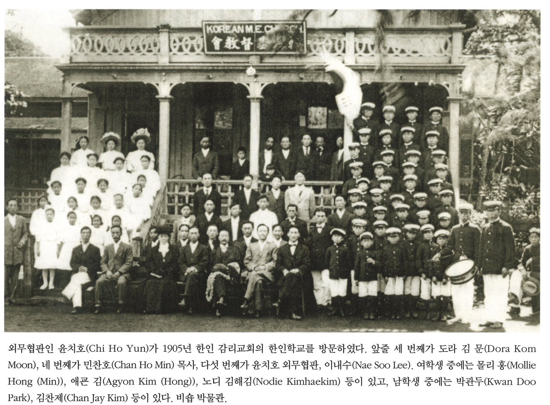외무협판인 윤치호(Chi Ho Yun)가 1905년 한인 감리교회의 한인학교를 방문하였다. 앞줄 세 번째가 도라 김 문(Dora Kom Moon), 네 번째가 민찬호(Chan Ho Min) 목사, 다섯 번째가 윤치호 의무협판, 이내수(Nae So Lee). 여학생 중에는 몰리 홍(Mollie Hong(Min)), 애굔 김(Agyon Kim(Hong)), 노디 김해김(Nodie Kimhaekim) 등이 있고, 남학생 중에는 박관두(Kwan Doo Park), 김찬제(Chan Jay Kim) 등이 있다. 비숍 박물관.