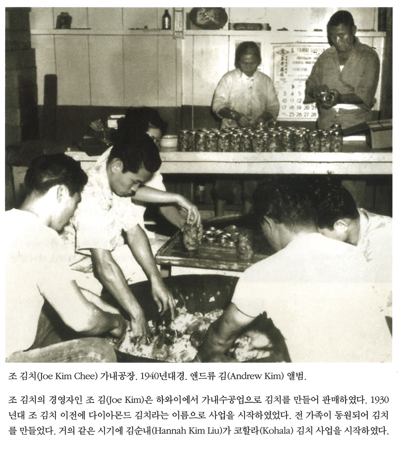조 김치(Joe Kim Chee) 가내공장. 1940년대경. 앤드류 김(Andrew Kim) 앨범. 조 김치의 경영자인 조 김(Joe Kim)은 하와이에서 가내수공업으로 김치를 만들어 판매하였다. 1930년대 조 김치 이전에 다이아몬드 김치라는 이름으로 사업을 시작하였었다. 전 가족이 동원되어 김치를 만들었다. 거의 같은 시기에 김순내(Hannah Kim Liu)가 코할라(Kohala) 김치 사업을 시작하였다.