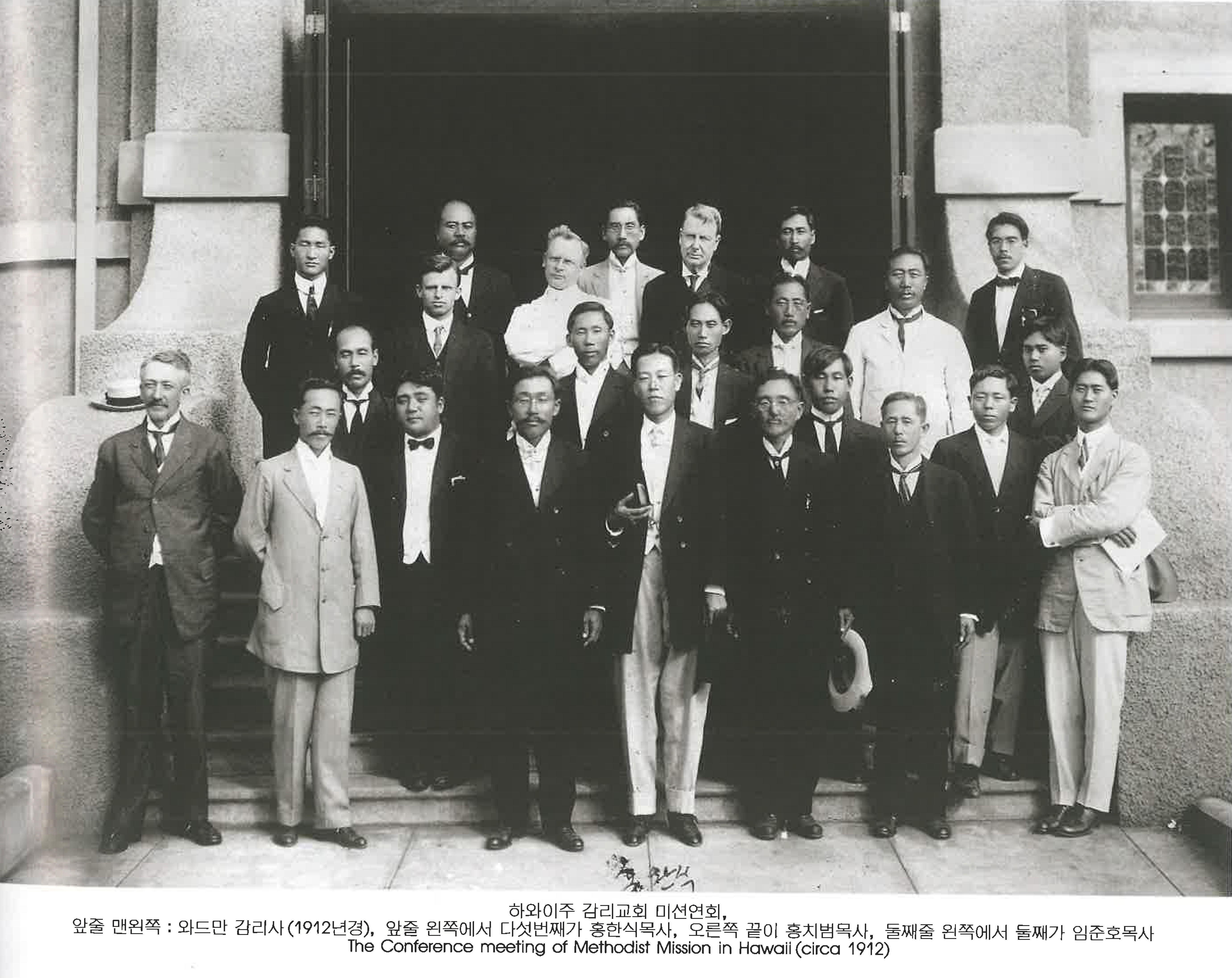 하와이주 감리교회 미션연회, 앞줄 맨왼쪽 : 와드만 감리사(1912년경), 앞줄 왼쪽에서 다섯번째가 홍한식목사, 오른쪽 끝이 홍치범목사 둘째줄 왼쪽에서 둘째가 임준호목사 The Conference meeting of Methodist Mission in Hawa ii (circa 1912)