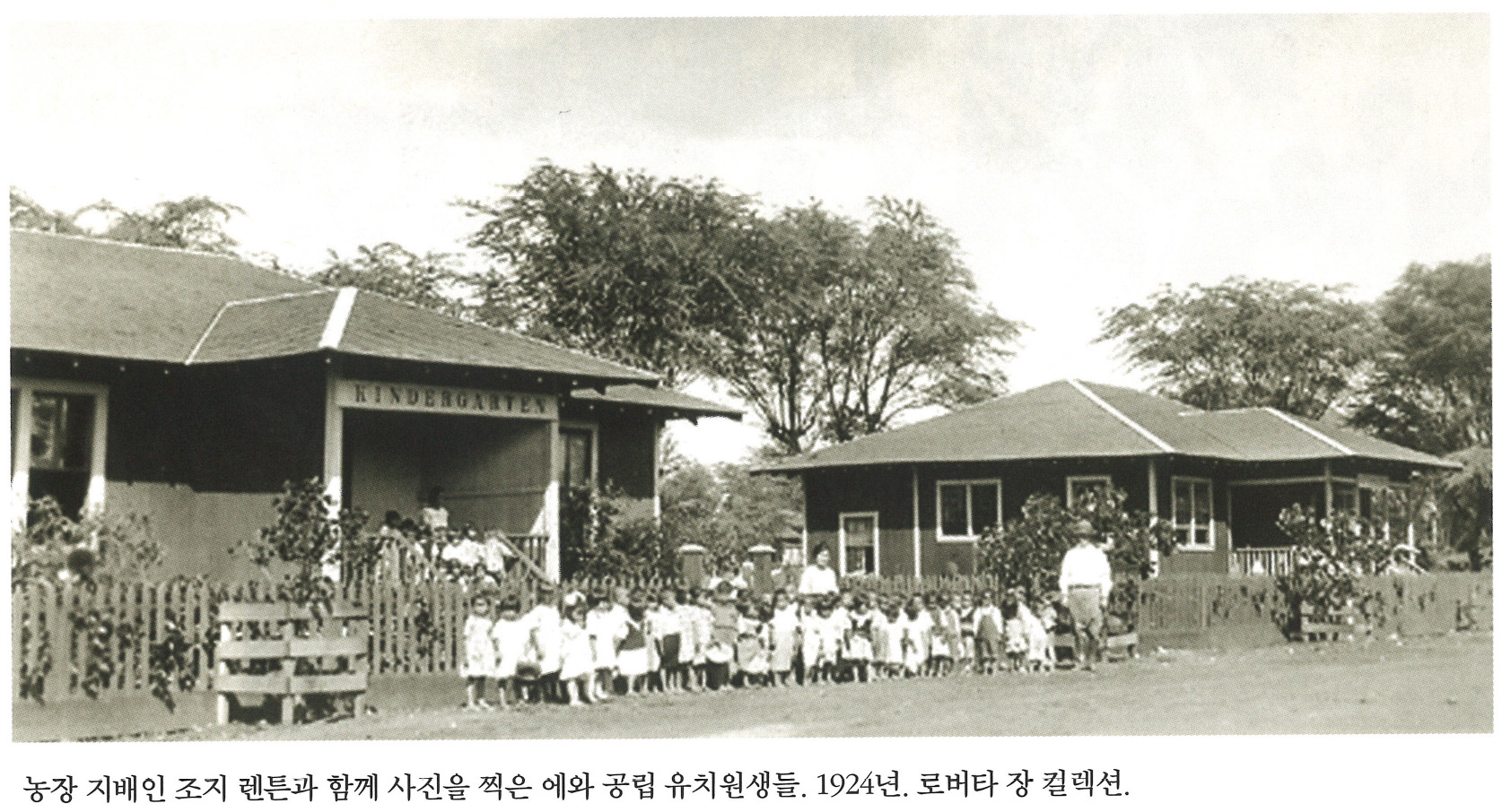농장 지배인 조지 렌튼과 함께 사진을 찍은 에와 공립 유치원생들. 1924년. 로버타 장 컬렉션.