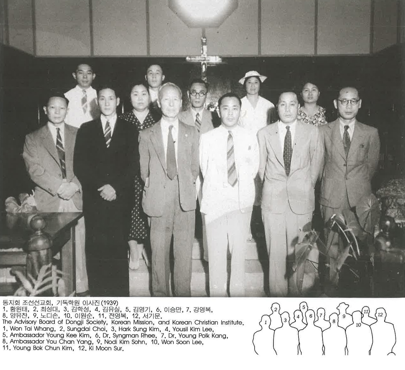 동지회 조선선교회, 기독학원 이사진 (I939) 1. 왕원타I,2. 최성대, 3. 김학성,4. 김유실, 5. 김영기, 6. 이승만, 7. 강영복, 8. 양유잔,9. 노디손,10. 이원순, 11. 전영복. 12. 서기문. The Advisory Board of Dongjl Society, Korean Mission, and Korean Christian Institute. I. Won Tai Whang, 2. Sungdal Choi, 3. Hark Sung Kim, 4. Yousil Kim Lee, 5. Ambassador Young Kee Kim, 6. Dr. Syngman Rhee, 7. Dr. Young Polk Kang, 8. Ambassador You Chan Yang, 9. Nodi Kim Sohn, 10. Won Soon Lee, 11. Young Bok Chun Kim, 12. KI Moon Sur.