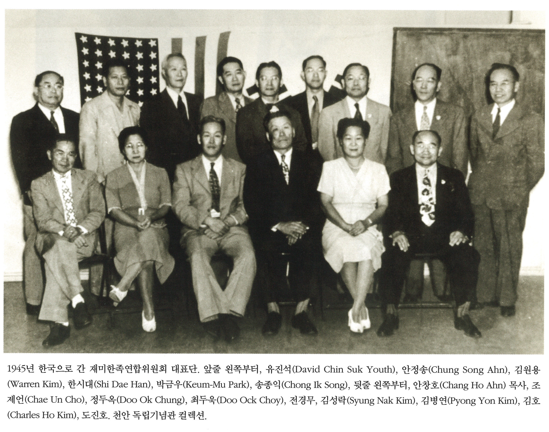 1945년 한국으로 간 재미한족연합위원회 대표단. 앞줄 왼쪽부터, 유진석(David Chin Suk Youth), 안정송(Chung Song Ahn), 김원용(Warren Kim), 한시대(Shi Dae Han), 박금우(Keum-Mu Park), 송종익(Chong Ik Song), 뒷줄 왼쪽부터, 안창호(Chang Ho Ahn) 목사, 조제언(Chae Un Cho), 정두옥(Doo Ok Chung), 최두욱(Doo Ock Choy), 전경무, 김성략(Syung Nak Kim), 김병연(Pyong Yon Kim), 김호(Charles Ho Kim), 도진호. 천안 독립기념관 컬렉션.