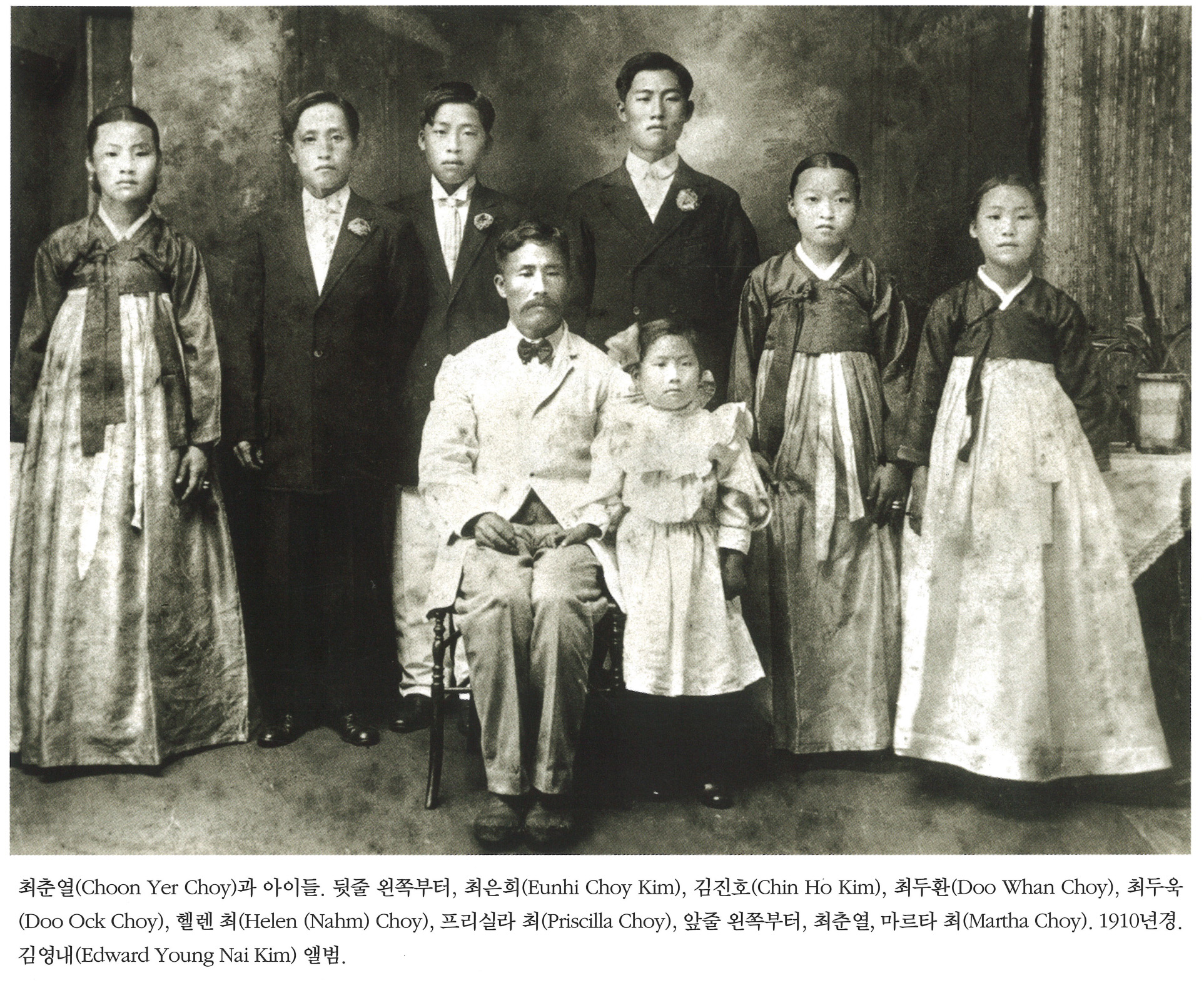 최춘열(Choon Yer Choi)과 아이들. 뒷줄 왼쪽부터, 최은희(Eunhi Choy Kim), 김진호(Chin Ho Kim), 최두환(Doo Whan Choy), 최두욱(Doo Ock Choy), 헬렌 최(Helen (Nahm) Choy), 프리실라 최(Priscilla Choy), 앞줄 왼쪽부터, 최춘열, 마르타 최(). 1910년경. 김영내(Edward Young Nai Kim) 앨범.