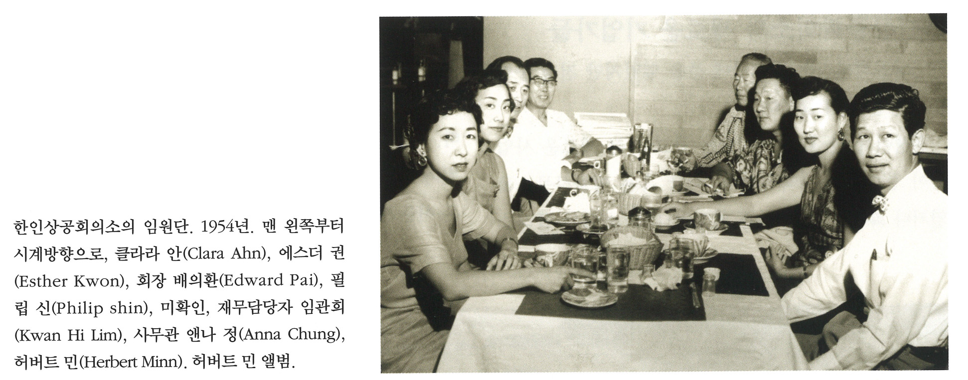 한인상공회의소의 임원단. 1954년. 맨 왼쪽부터 시계방향으로, 클라라 안(Clara Ahn), 에스더 권(Esther Kwon), 회장 배의환(Edward Pai), 필립 신(Philip Shin), 미확인, 재무담당자 임관희(Kwan Hi Lim), 사무관 앤나 정(Anna Chung), 허버트 민(Herbert Minn). 허버트 민 앨범