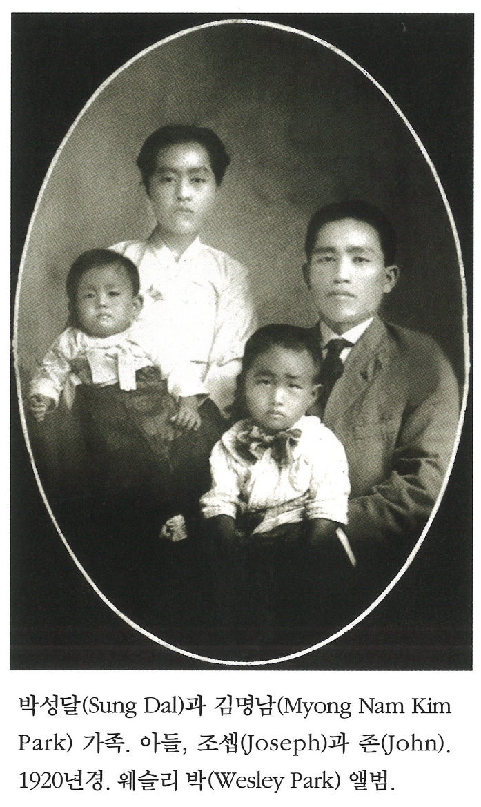 박성달(Sung Dal)과 김명남(Myong Nam Kim) 가족. 아들, 조셉(Joesph)과 존(John). 1920년경. 웨슬리 박(Wesley Park) 앨범.