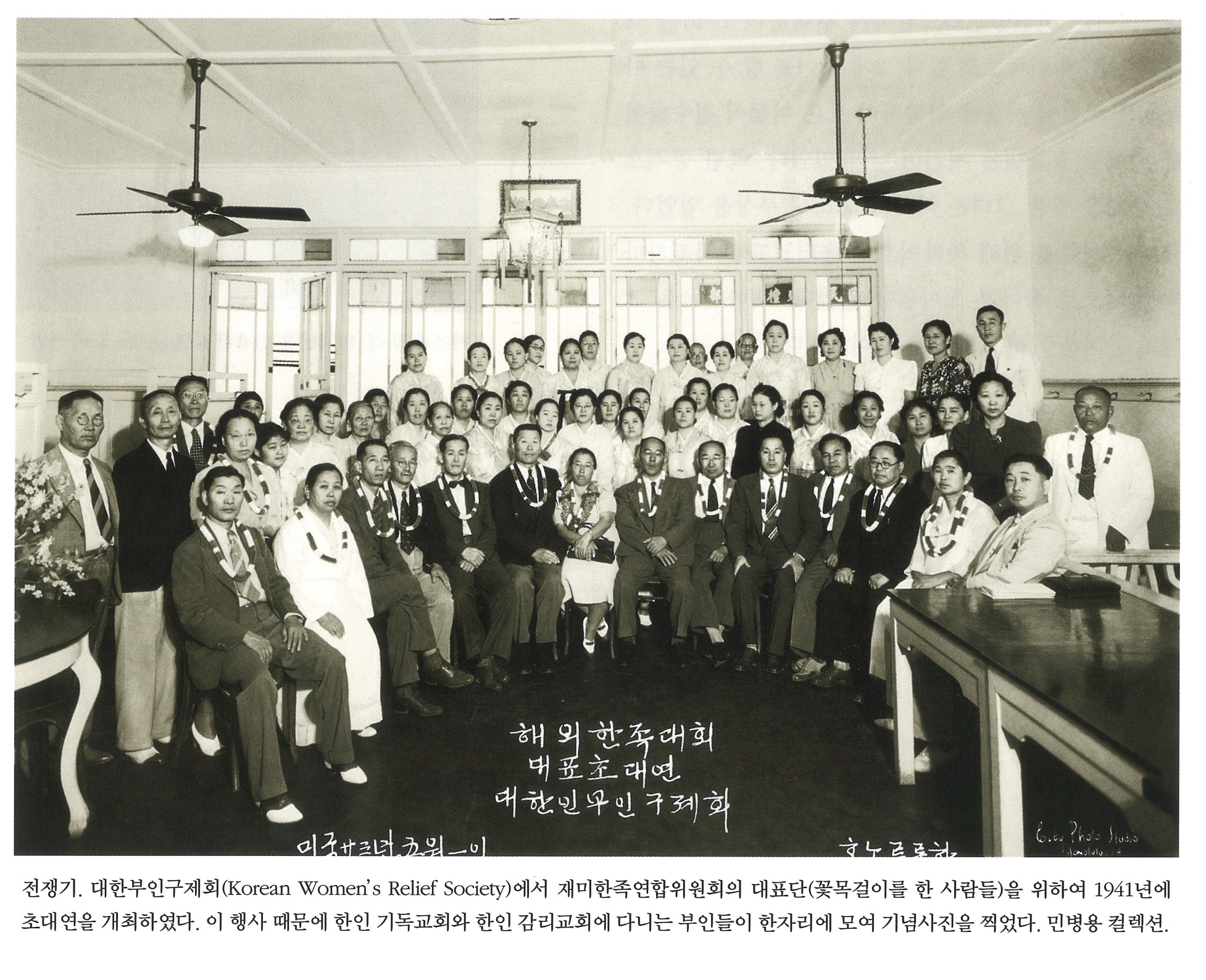 전쟁기. 대한부인구제회(Korean Women's Relief Society)에서 재미한족연합위원회의 대표단(꽃목걸이를 한 사람들)을 위하여 1941에 초대연을 개최하였다. 이 행사 때문에 한인 기독교회와 한인 감리교회에 다니는 부인들이 한자리에 모여 기념사진을 찍었다. 민병용 컬렉션.