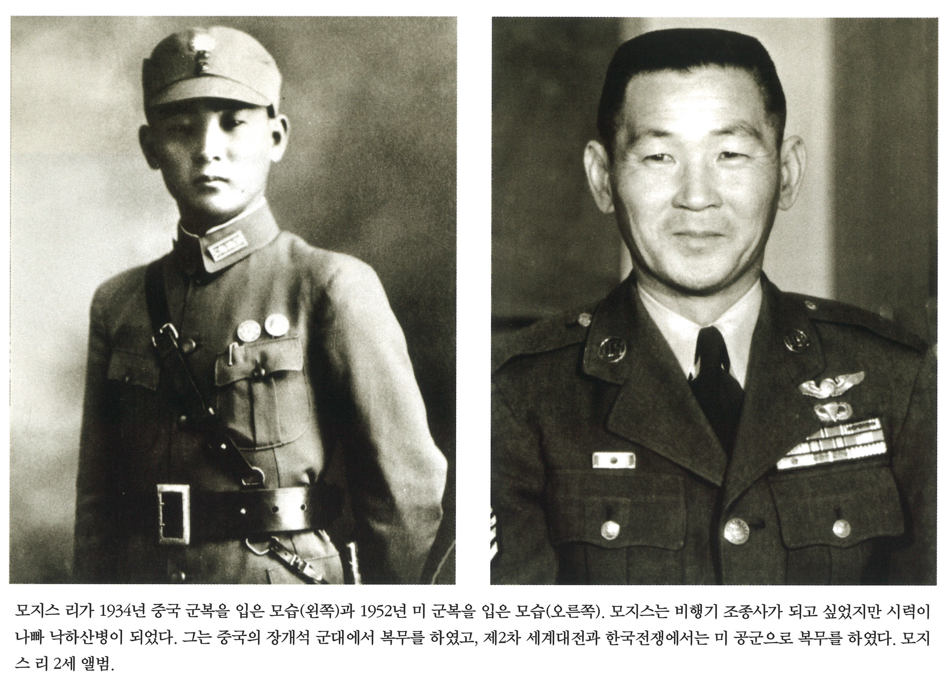 모지스 리가 1934년 중국 군복을 입은 모습(왼쪽)과 1952년 미 군복을 입은 모습(오른쪽). 모지스는 비행기 조종사가 되고 싶었지만 시력이 나빠 낙하산병이 되었다. 그는 중국의 장개석 군대에서 복무를 하였고, 제2차 세계대전과 한국전쟁에서는 미 공군으로 복무를 하였다. 모지스 리 2세 앨범.