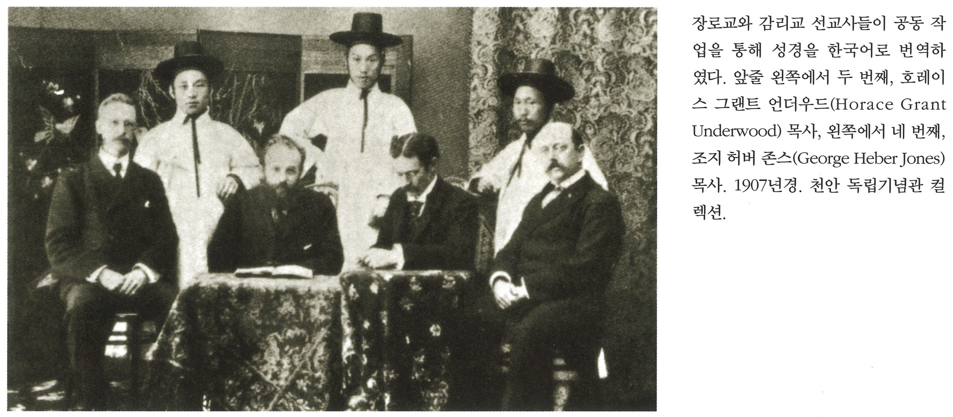 장로교와 감리교 선교사들이 공동 작업을 통해 성경을 한국어로 번역하였다. 앞줄 왼쪽에서 두 번째, 호레이스 그랜트 언더우드(Horace Grant Underwood) 목사, 왼쪽에서 네 번째, 조지 허버 존스 (George Herber Jones) 목사. 1907년경. 천안 독립기념관 컬렉션.