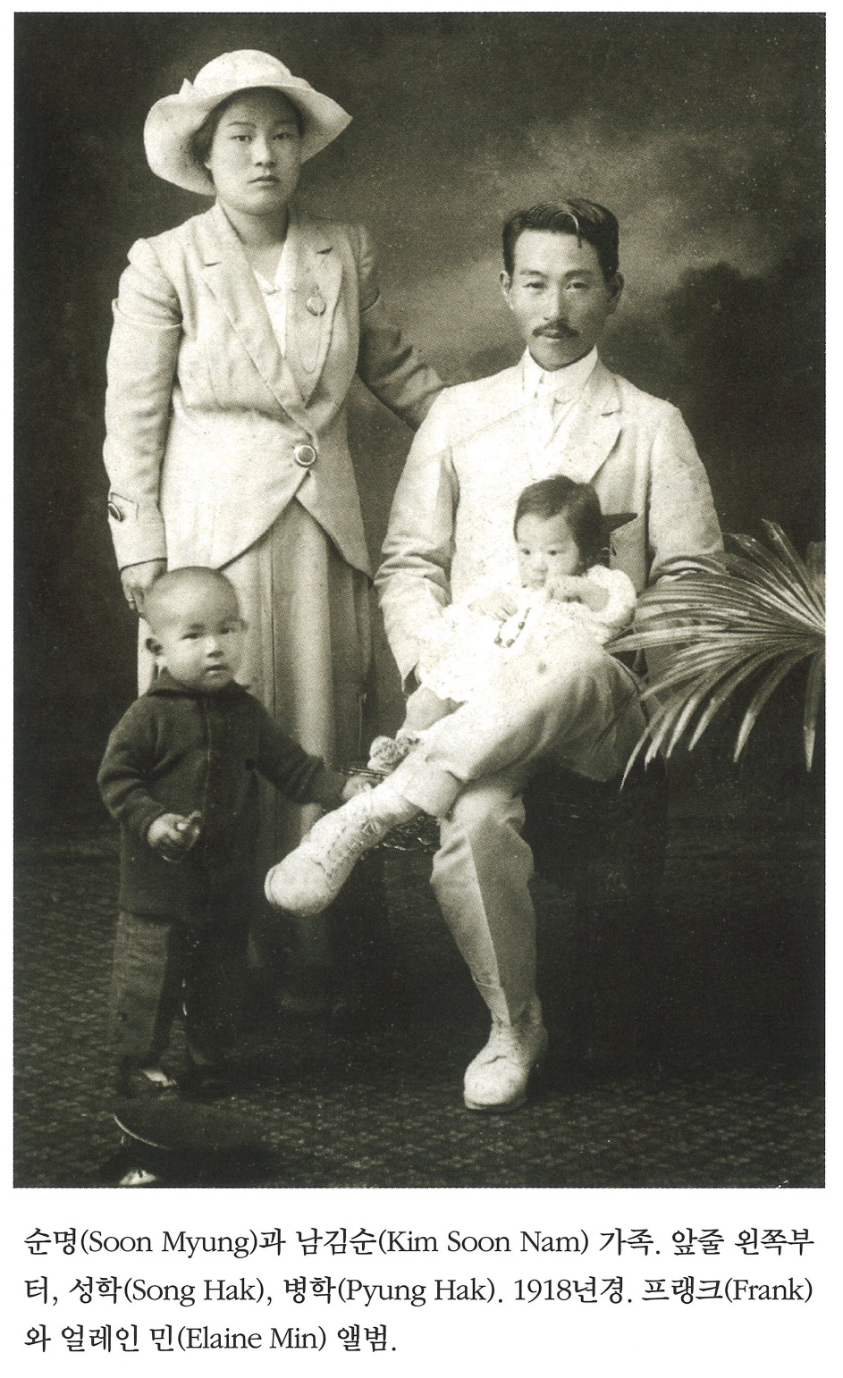 순명(Soon Myung)과 남김순(Kim Soon Nam) 가족. 앞줄 왼쪽부터, 성학(Song Hak), 병학(Pyun Hak). 1918년경. 프랭크(Frank)와 얼레인 민(elaine Min) 앨범.