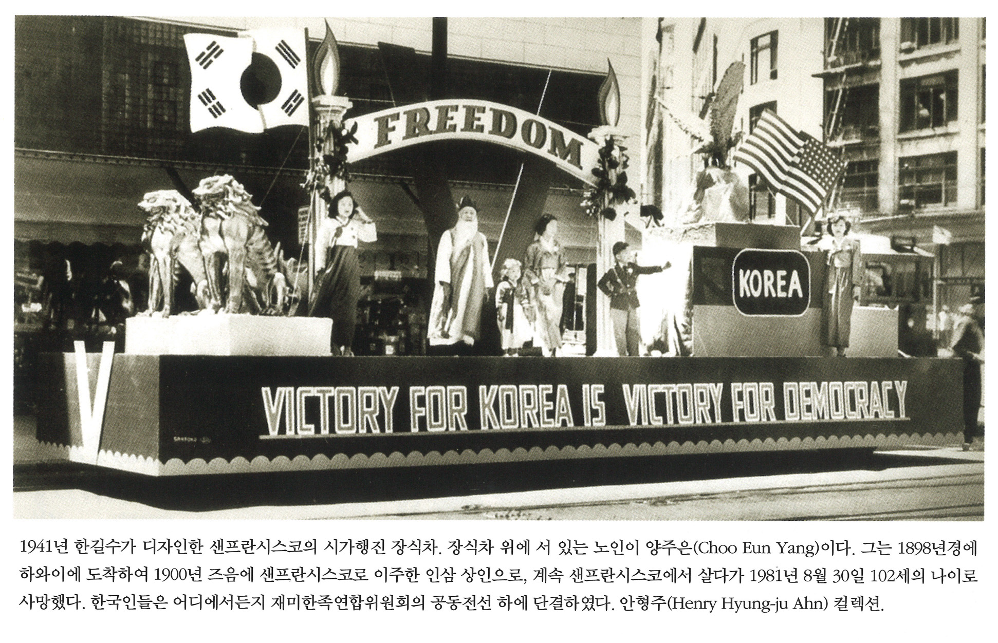 1941년 한길수가 디자인한 샌프란시스코의 시가행진 장식차. 장식차 위에 서 있는 노인이 양주은(Choo Eun Yang)이다. 그는 1898년에 하와이에 도착하여 1900년 즈음에 샌프란시스코로 이주한 인삼 상인으로, 계속 샌프란시스코에 살다가 1981년 8월 30일 102세의 사망했다. 한국인들은 어디에서든지 재미한족연합위원회의 공동전선 하에 단결하였다. 안형주(Henry Hyung-ju Ahn) 컬렉션.