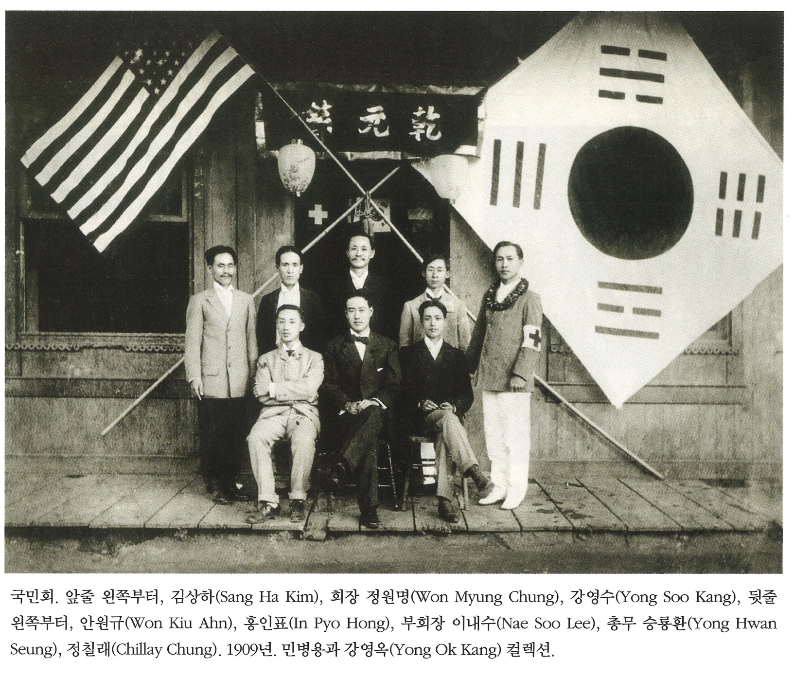 국민회. 앞줄 왼쪽부터, 김상하(Sang Ha Kim), 회장 정원명(Won Myung Chung), 강영수(Yon Soo Kang), 뒷줄 왼쪽부터, 안원규(Won Kiu Ahn), 홍인표(In Pyo Hong), 부회장 이내수(Nae Soo Lee), 총무 승룡환(Yong Hwan Seung), 정칠래(Chillay Chung). 1909년. 민병용과 강영옥(Yong Ok Kang) 컬렉션.