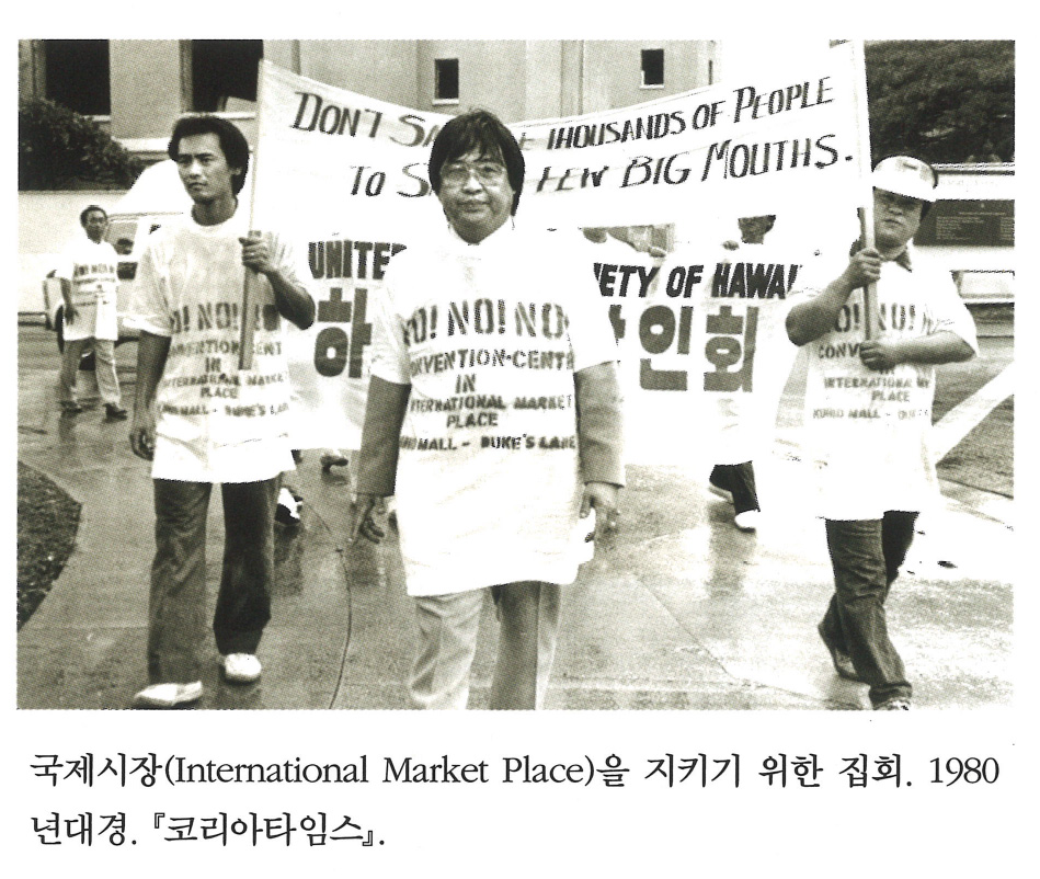 국제시장(International Market Place)을 지키기 위한 집회. 1980년대경. 『코리아타임스 』.